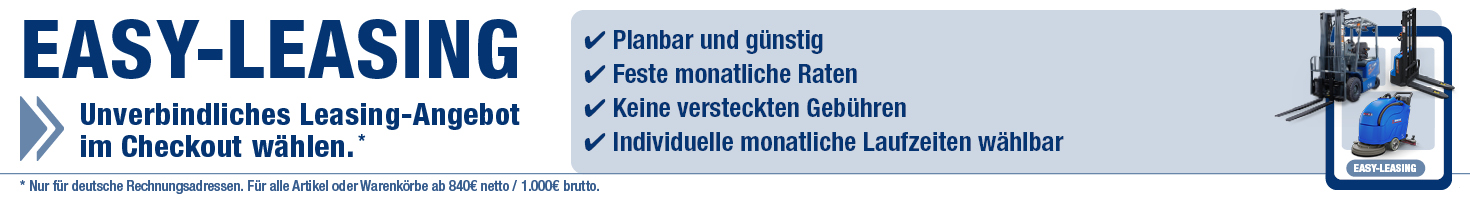 Sie möchten in ein Transportgerät, einen Stapler oder neue Betriebsausstattung investieren, ohne Ihr Eigenkapital zu belasten? Unser „Easy Leasing“ bieten Ihnen für genau diesen Fall eine flexible und planbare Finanzierungsmöglichkeit. Gerade für kleine und mittelständische Unternehmen ist Leasing eine attraktive Alternative zum Kauf, da es die Liquidität schont, Investitionen erleichtert und finanzielle Spielräume schafft. Anstatt einen Kredit für die Einmalzahlung aufzunehmen, können Sie mit festen, günstigen Monatsraten Ihre Wunschprodukte sofort nutzen und gleichzeitig Ihr Kapital für andere wichtige Unternehmensbereiche nutzen. Dank individuell wählbarer Laufzeit können Sie die monatlichen Raten genau an Ihr Budget anpassen, ganz ohne versteckte Gebühren.