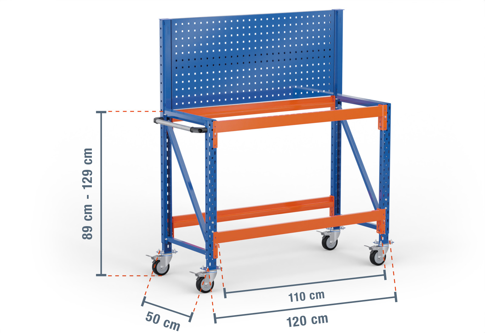 1,2 m Arbeitstisch fahrbar MFW1000-AT / 50 cm tief / 890 - 1.290 mm hoch / 2 Ebenen / Lochrückwand