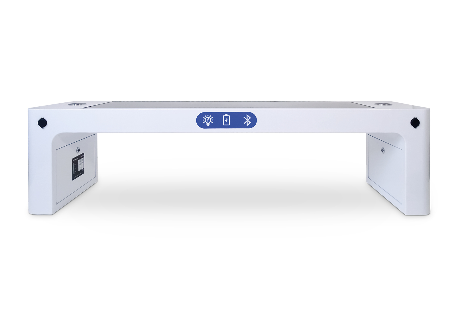 Das 90 W-Solarmodul ist in die Sitzfläche integriert und besitzt eine robuste, wetterbeständige Oberfläche. Die Energie wird in einer Li-Ion (12 V / 55 Ah) gespeichert. Dadurch bleiben die Ladepunkte sowie die automatische LED-Umgebungsbeleuchtung auch bei wechselhaftem Wetter funktionsfähig. Die Lichter, die sich unter der Bank befinden, schalten sich bei Dunkelheit automatisch ein und bei ausreichender Helligkeit wieder ab. Die Beleuchtung wird mit 12 V betrieben, hat eine Leistung von 10 W und eine Farbtemperatur von rund 3.500 K.