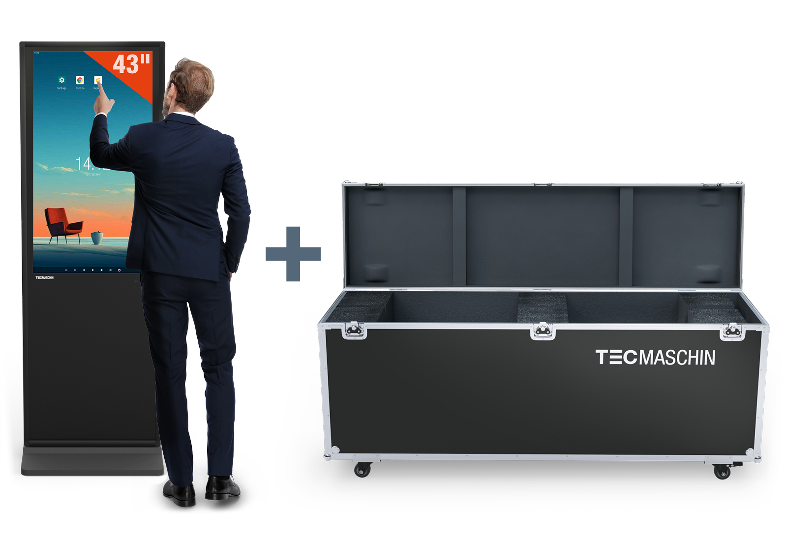 - 1 x Digitaler Kundenstopper DKST-LED43 mit Touchscreen inkl. Transportbox, Schwarz, 43 in Display, Android 13, TecMaschin
