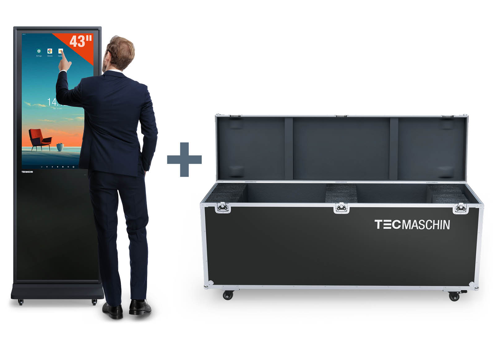 - 1 x Mobiler digitaler Kundenstopper DKST-LED43 mit Touchscreen inkl. Transportbox, Schwarz, 43 in Display, Android 13, TecMaschin