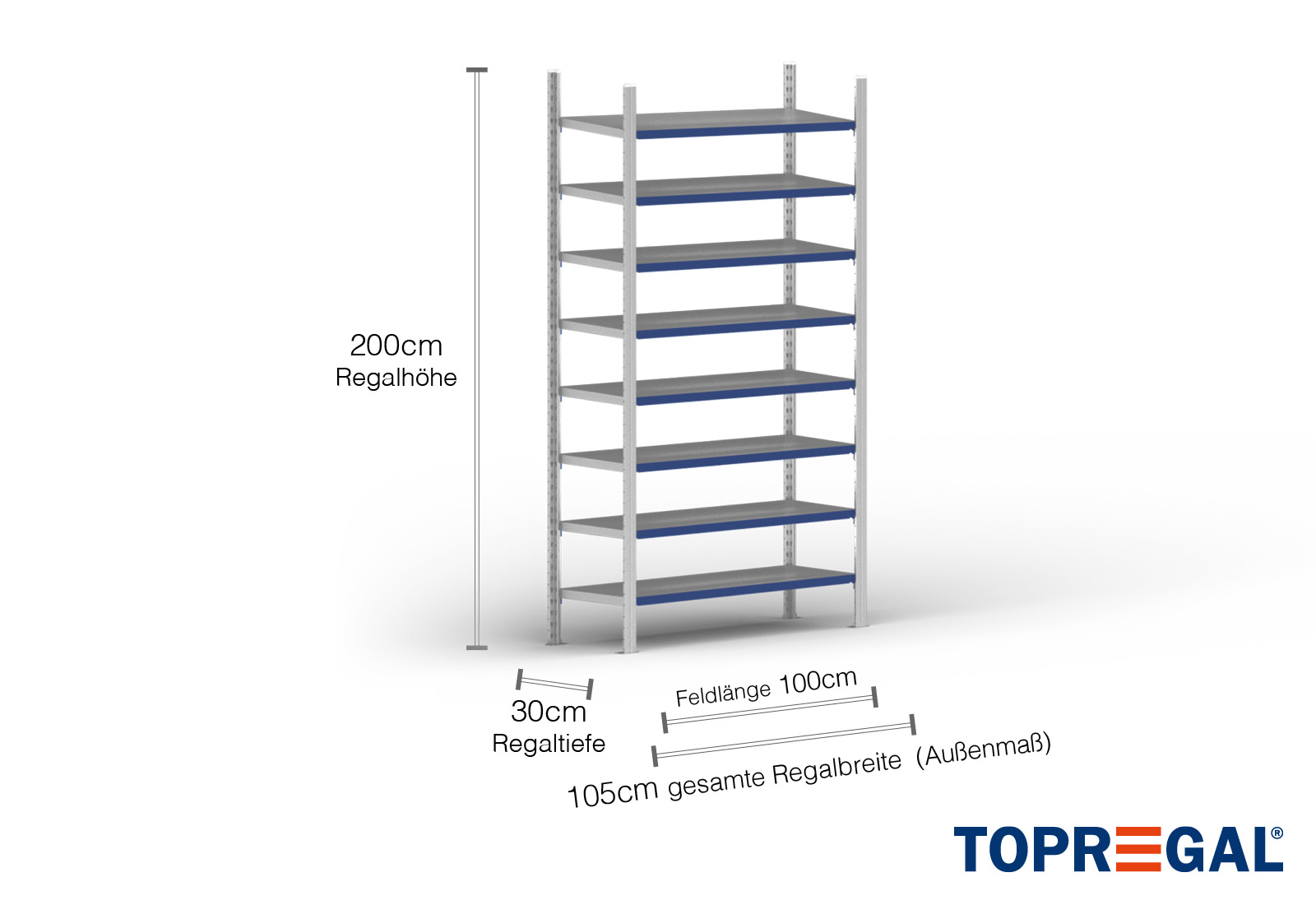 1 m Fachbodenregal FB200 / 30 cm tief / 2 m hoch / 8 Ebenen / Auflage Stahl / Fachlast 200 kg