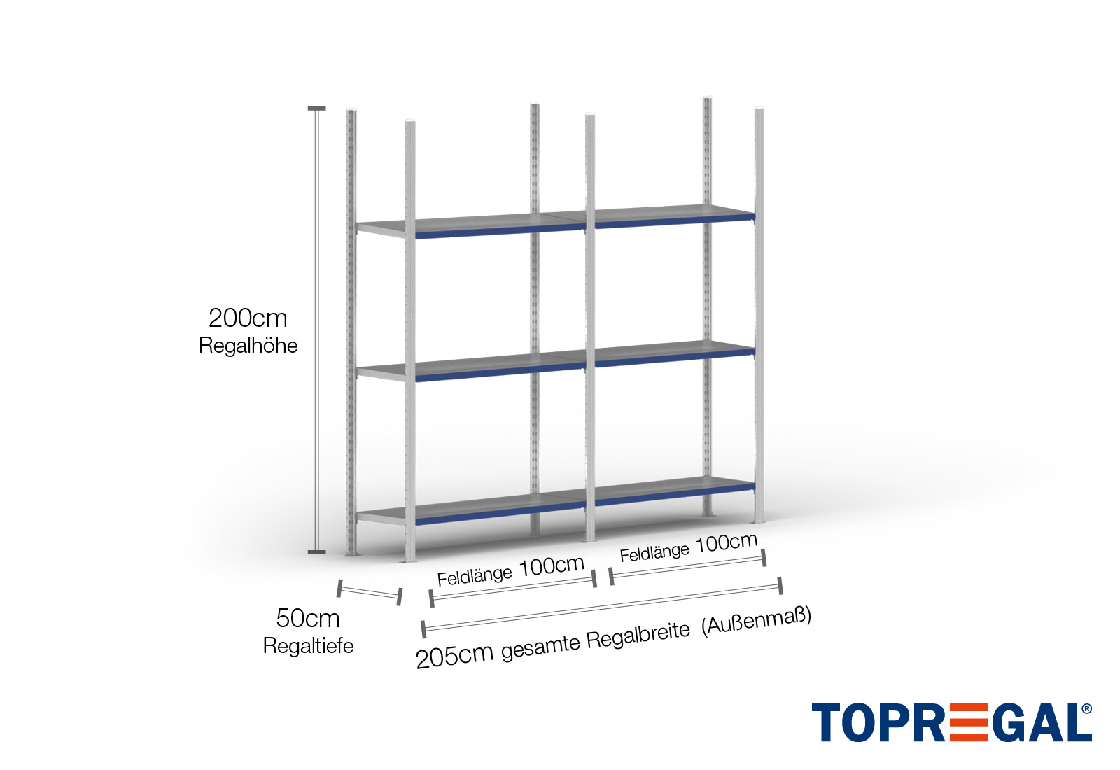 2 m Fachbodenregal FB200 / 50 cm tief / 2 m hoch / 3 Ebenen / Auflage Stahl / Fachlast 200 kg