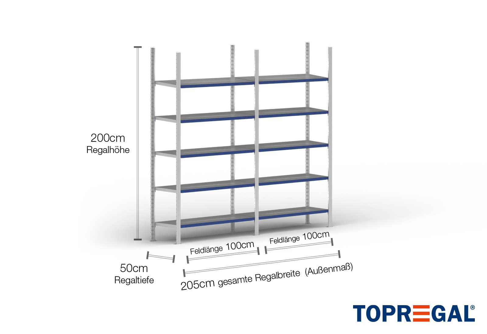 2 m Fachbodenregal FB200 / 50 cm tief / 2 m hoch / 5 Ebenen / Auflage Stahl / Fachlast 200 kg
