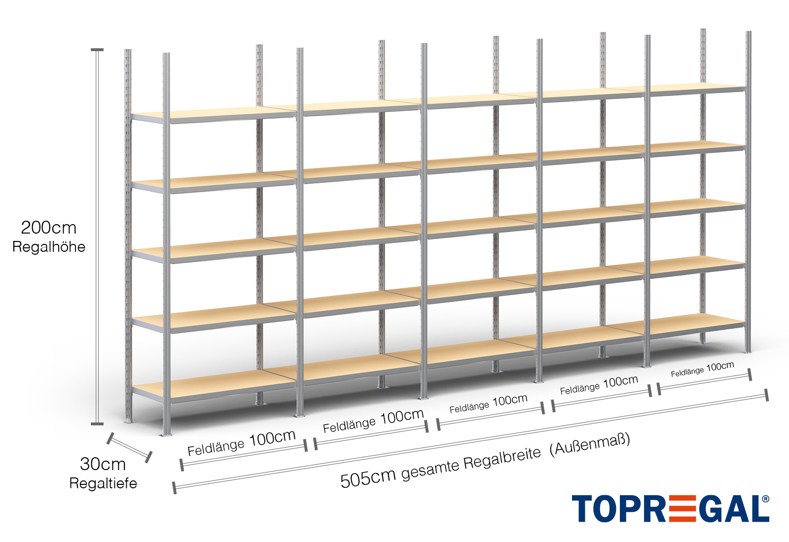 5 m Fachbodenregal FB200 / 30 cm tief / 2 m hoch / 5 Ebenen / Auflage Holz / Fachlast 200 kg