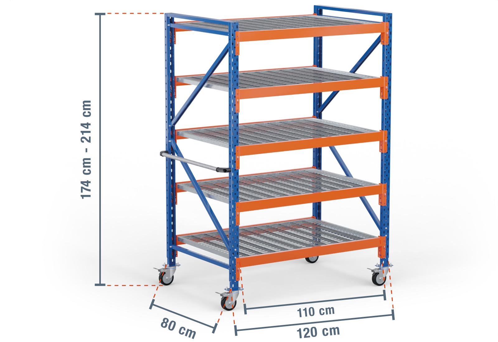 Das komplette Regal ist mit zwei 1,74 m hohen Ständern und vier beweglichen Rollen, inkl. Feststellbremsen ausgestattet und damit für den mobilen Einsatz geeignet. Es ist speziell für den gewerblich industriellen Betrieb angefertigt und hält somit auch härteren Arbeitsumgebungen stand. Jegliches Montagematerial ist im Lieferumfang bereits enthalten.
