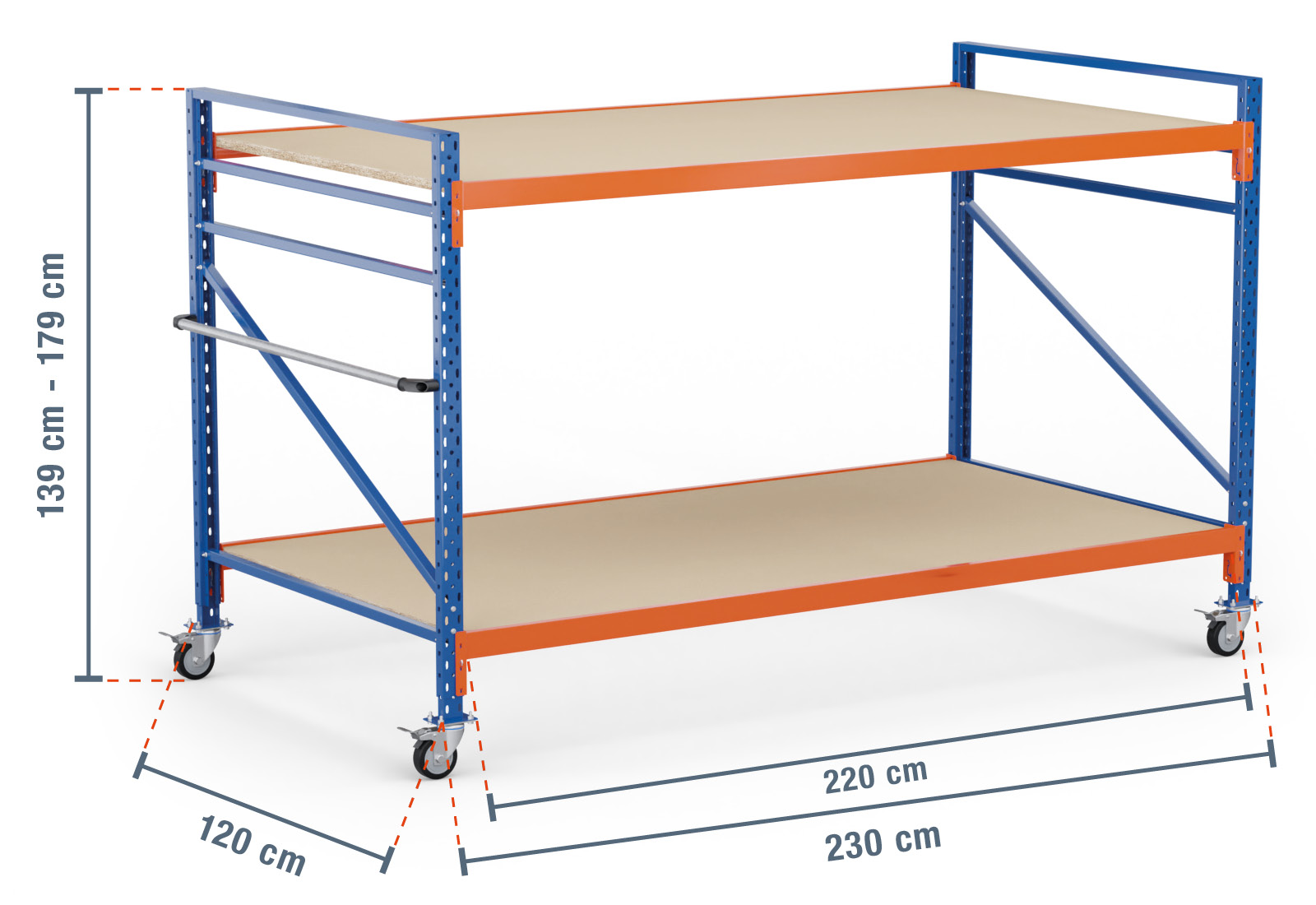 2,3 m Lagerregal fahrbar LR2000 / 120 cm tief / 1.390 - 1.790 mm hoch / 2 Ebenen / Auflage Holz