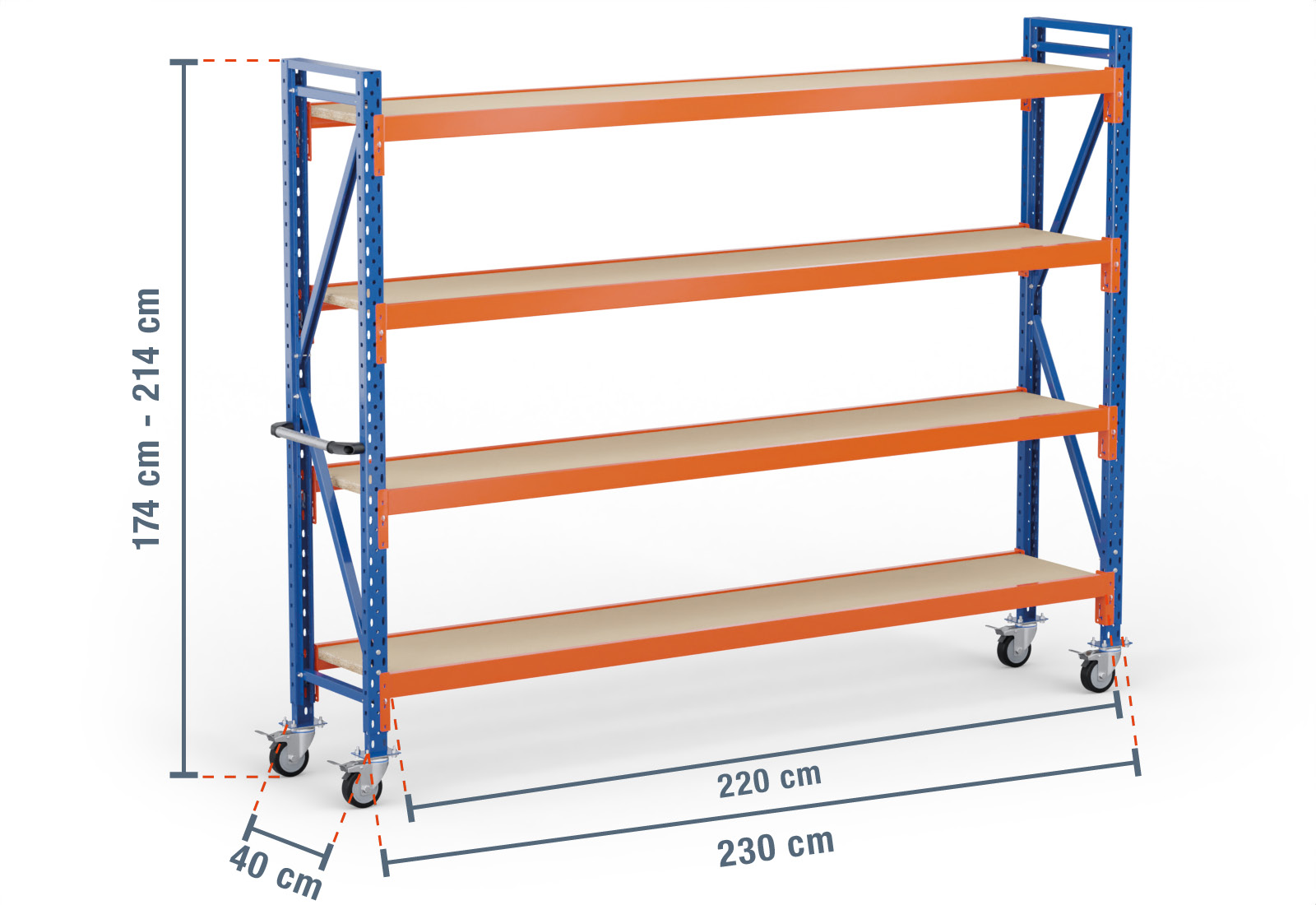 2,3 m Lagerregal fahrbar LR2000 / 40 cm tief / 1.740 - 2.140 mm hoch / 4 Ebenen / Auflage Holz