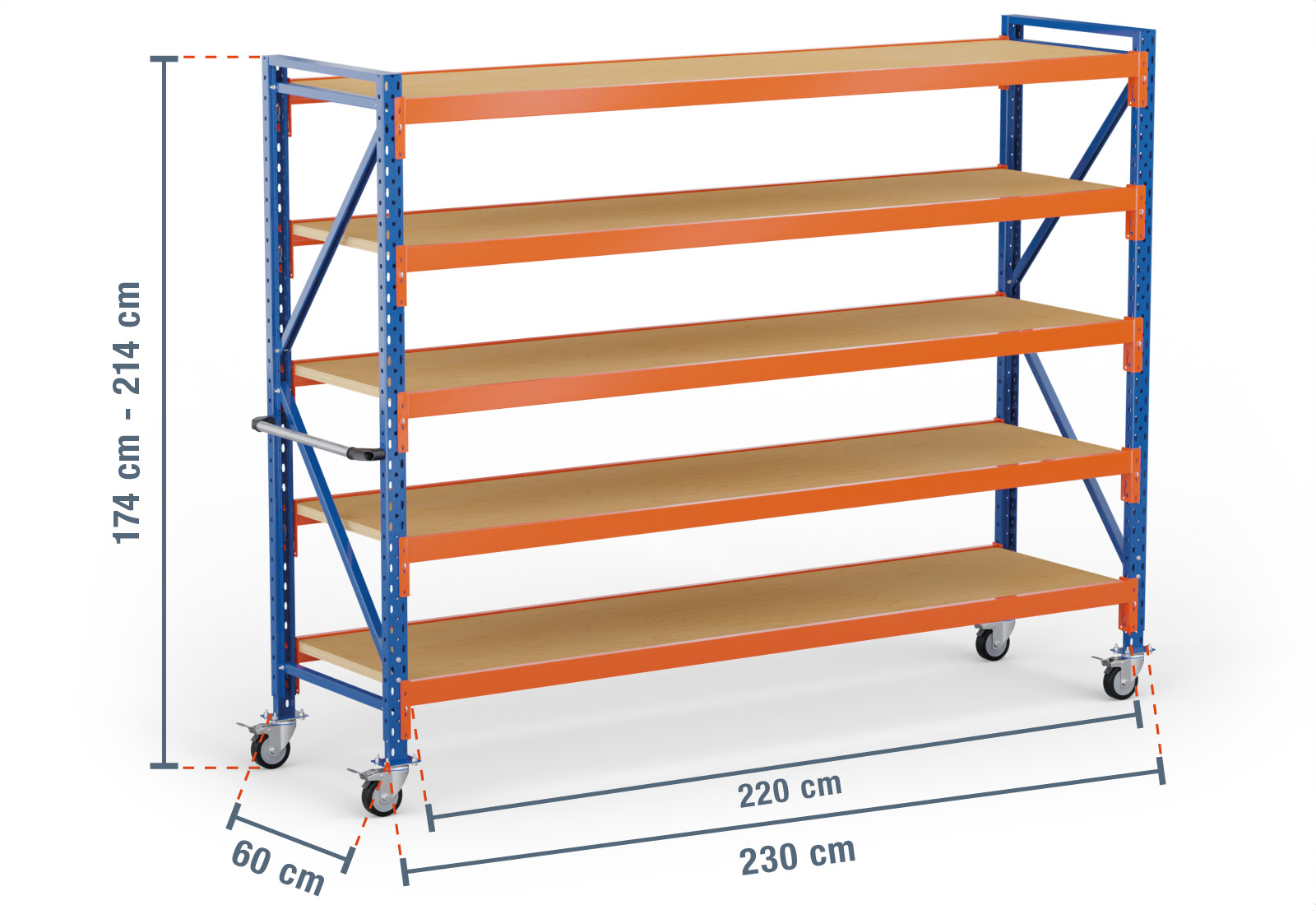 2,3 m Lagerregal fahrbar LR2000 / 60 cm tief / 1.740 - 2.140 mm hoch / 5 Ebenen / Auflage Multiplex
