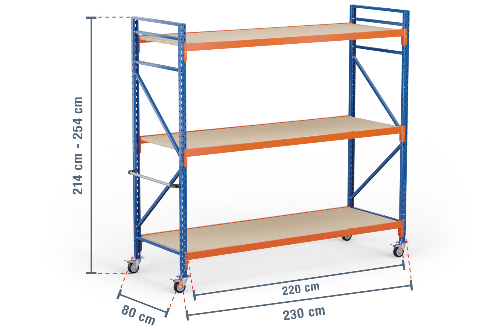 2,3 m Lagerregal fahrbar LR2000 / 80 cm tief / 2.140 - 2.540 mm hoch / 3 Ebenen / Auflage Holz