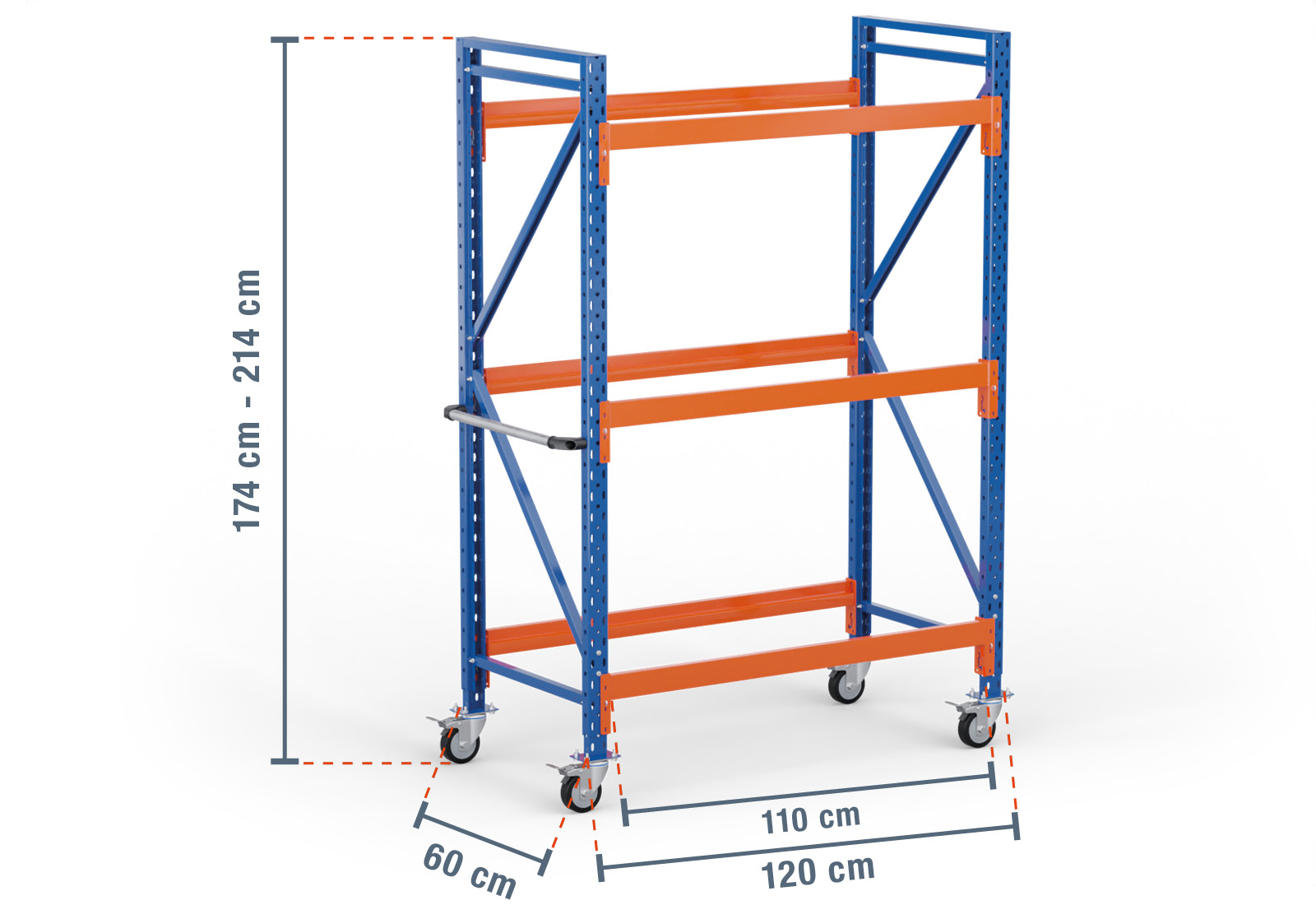 1,2 m Reifenregal fahrbar RR2000 / 60 cm tief / 1.740 - 2.140 mm hoch / 3 Ebenen