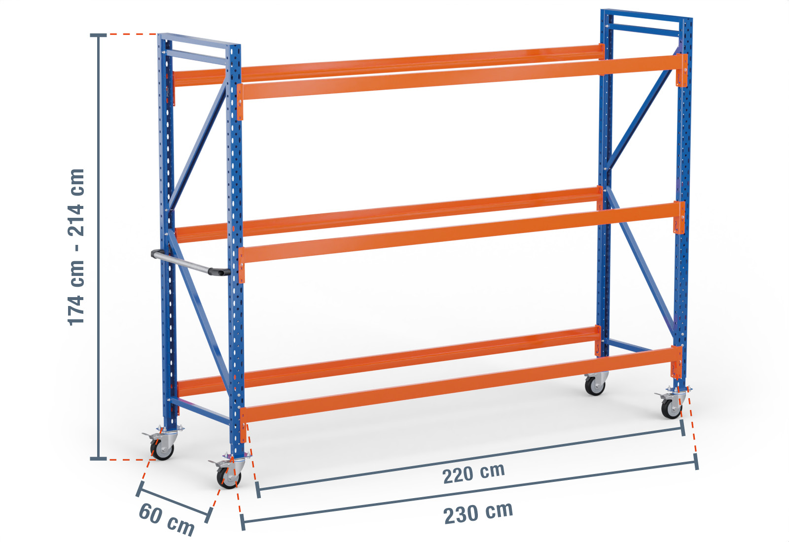 2,3 m Reifenregal fahrbar RR2000 / 60 cm tief / 1.740 - 2.140 mm hoch / 3 Ebenen