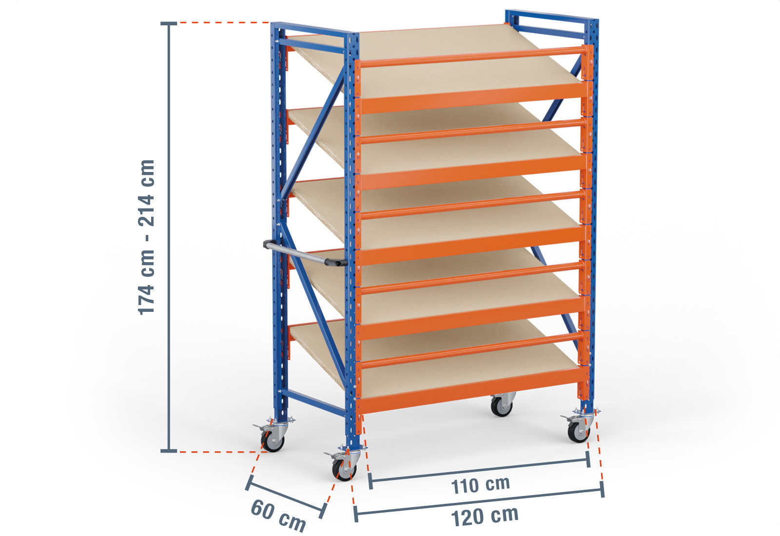 1,2 m Arbeitstisch Schrägbodenregal fahrbar SR1500 / 60 cm tief / 1.740 - 2.140 mm hoch / 5 Ebenen / Auflage Holz