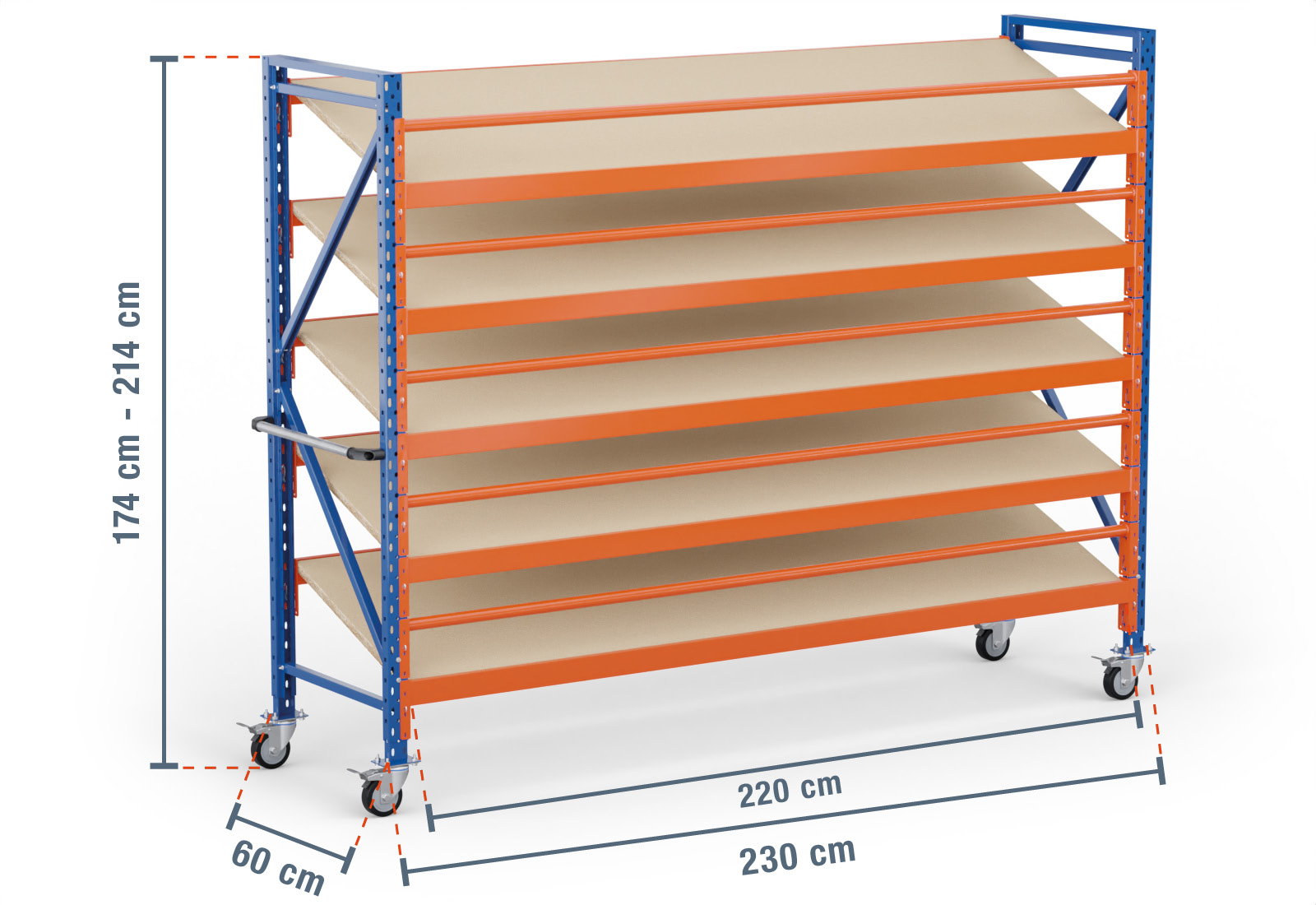 2,3 m Arbeitstisch Schrägbodenregal fahrbar SR1500 / 60 cm tief / 1.740 - 2.140 mm hoch / 5 Ebenen / Auflage Holz