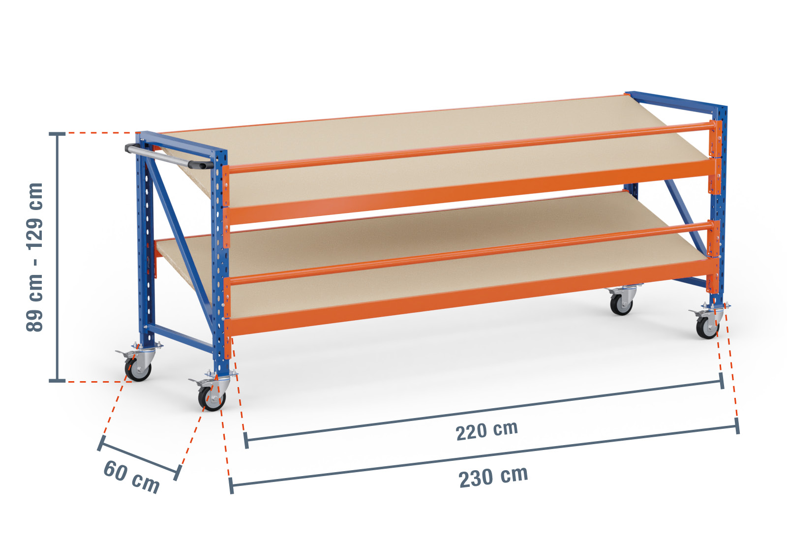 2,3 m Arbeitstisch Schrägbodenregal fahrbar SR1500 / 60 cm tief / 890 - 1.290 mm hoch / 2 Ebenen / Auflage Holz
