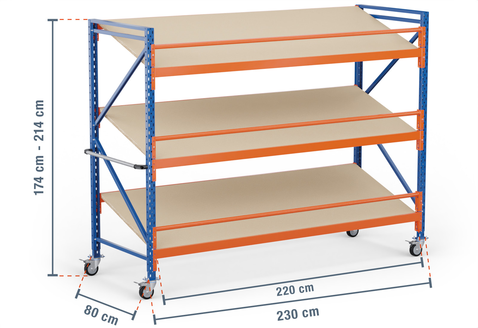 Das Außenmaß dieses fahrbaren Schrägbodenregals beträgt 2,3 m, wobei die nutzbare Auflagefläche, das so genannte Innenmaß 10 cm kürzer ist. Hierbei beträgt die maximale Belastbarkeit eines Regalfachs 300 kg und die Feldlast (maximale Belastung zwischen zwei Regalständern bei gleichmäßiger Gewichtsverteilung) liegt bei 500 kg.