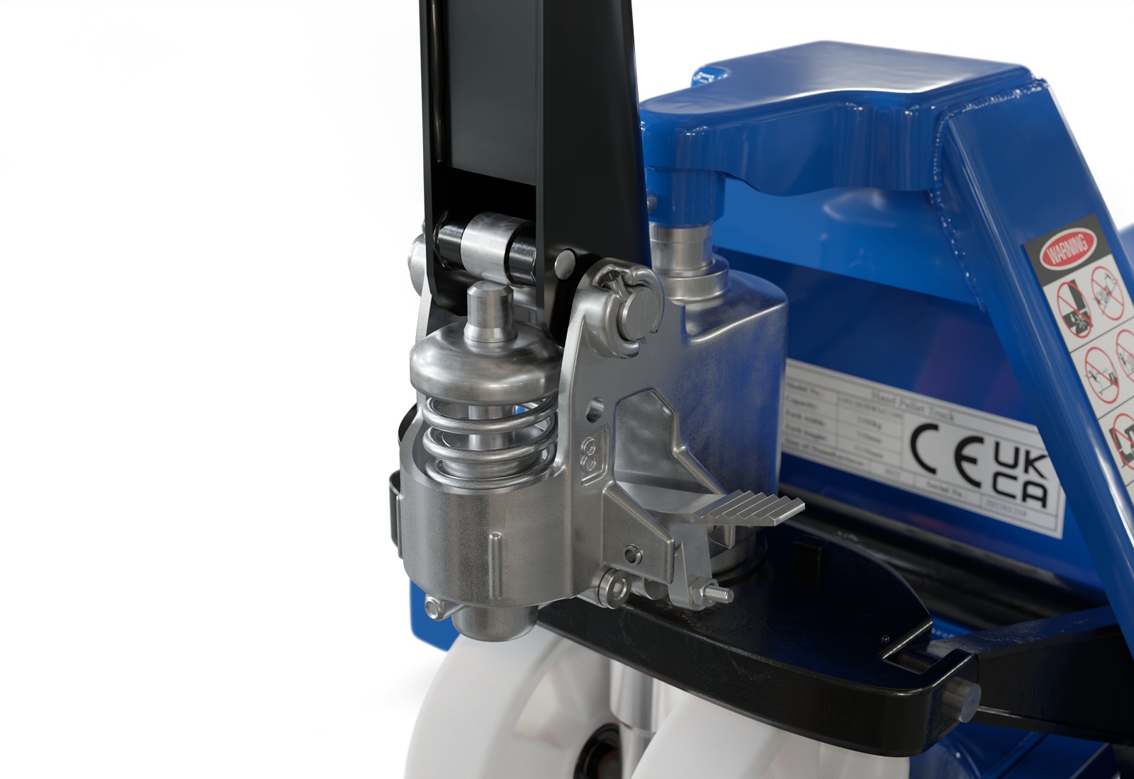 Die Stahlkonstruktion des SolidHub Handhubwagens ist blau pulverbeschichtet und somit bestens für den harten Einsatz in Lager und Produktion geschaffen. Dezent aber sichtbar befinden sich auf den Gabeln Markierungen, die anzeigen, wann eine Europalette komplett unterfahren wurde und sicher angehoben werden kann. Der Abstand von Gabel zum Untergrund beträgt 34 mm. Die verbaute Hub-Hydraulik kann mittels vorhandenem Schmiernippel einfach und schnell gewartet werden.
