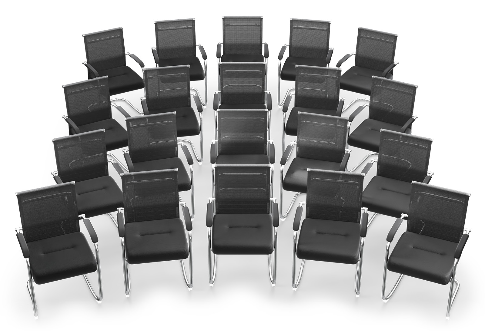 Bequeme Konferenzstühle mit Armlehne und als Freischwinger machen bei längeren Besprechungen – egal, ob mit Kunden, Dienstleistern oder Bewerbern – den Unterschied. Sie müssen repräsentativ aussehen, ebenso bequem wie langlebig sein und dennoch erschwinglich bleiben. All das vereint der Konferenzstuhl MARINA im klassischen Schwarz mit Gestell aus Chrom. Die Rückenlehne ist 470 mm hoch und besteht aus atmungsaktivem Netzstoff. Der Stuhl hat eine Sitzhöhe von 450 mm, sowie eine Sitzfläche von 490 mm x 500 mm. Die schwarze Armlehne ist 645 mm hoch. Der solide verarbeitete Metallfuß, die Armlehnen aus stabilem Kunststoff und die aus strapazierfähigem Textilgewebe gefertigte Sitzfläche sorgen für ein langlebiges und angenehmes Sitzvergnügen. Die 20 Besucherstühle werden in Einzelteilen verpackt geliefert. Es handelt sich bei dem Modell MARINA um einen Freischwinger-Stuhl.