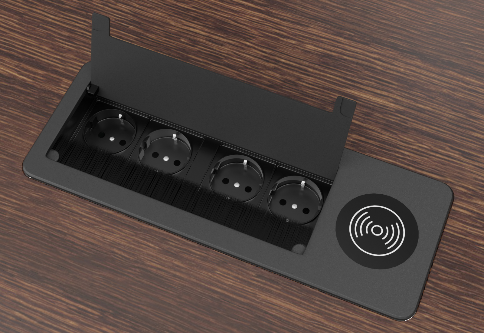 Das ist der große Konferenztisch ELLA480i. Dieser hat in der Mitte der Tischplatte nicht nur 3 Steckerleisten integriert, in die Laptop und Beamer bequem eingesteckt werden können, sondern ebenso 3 Induktionsboxen, die für alle gängigen Smartphones genutzt werden können. Die Induktionsladefläche funktioniert mit allen Mobiltelefonen, welche für kabelloses Laden geeignet sind.