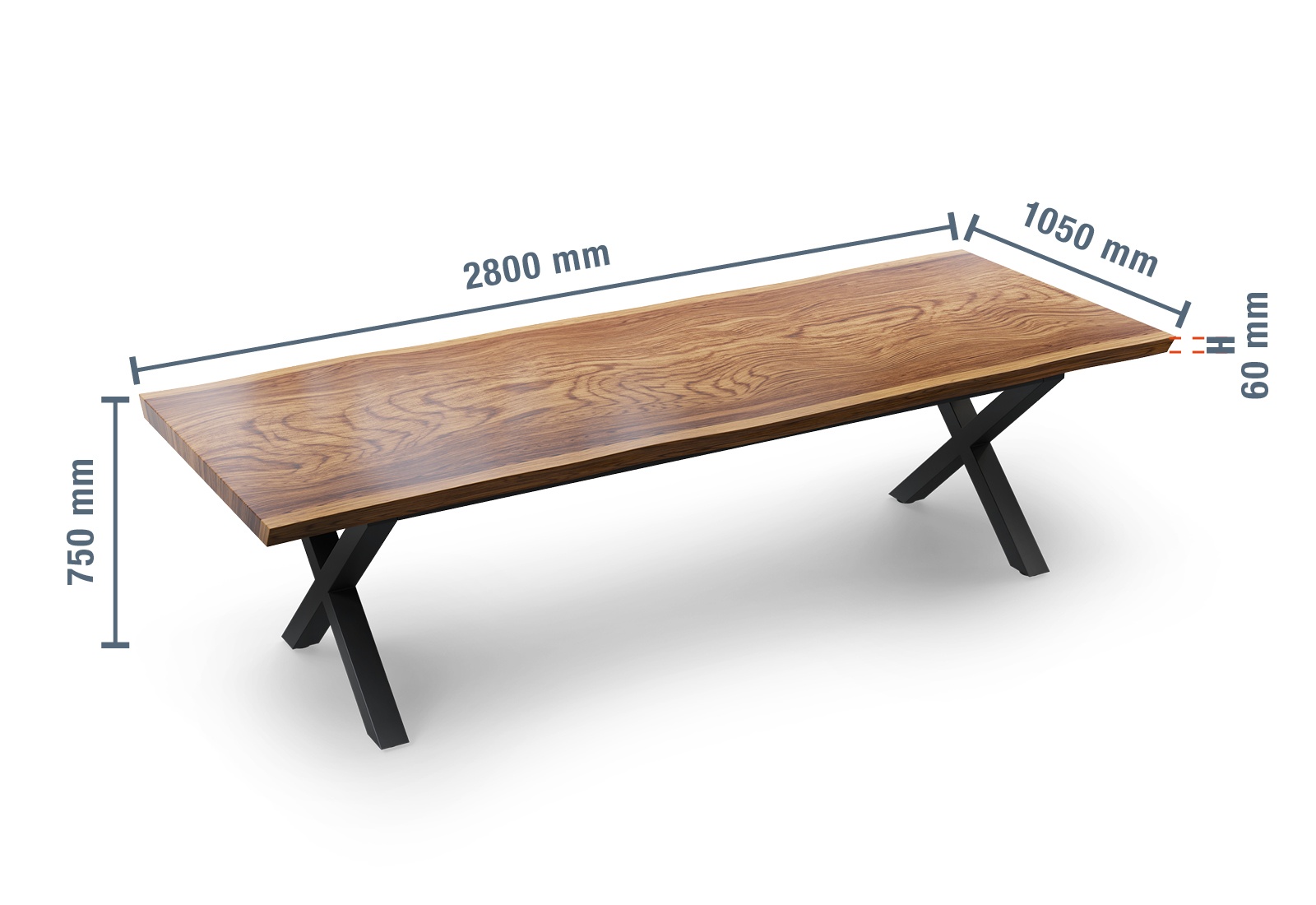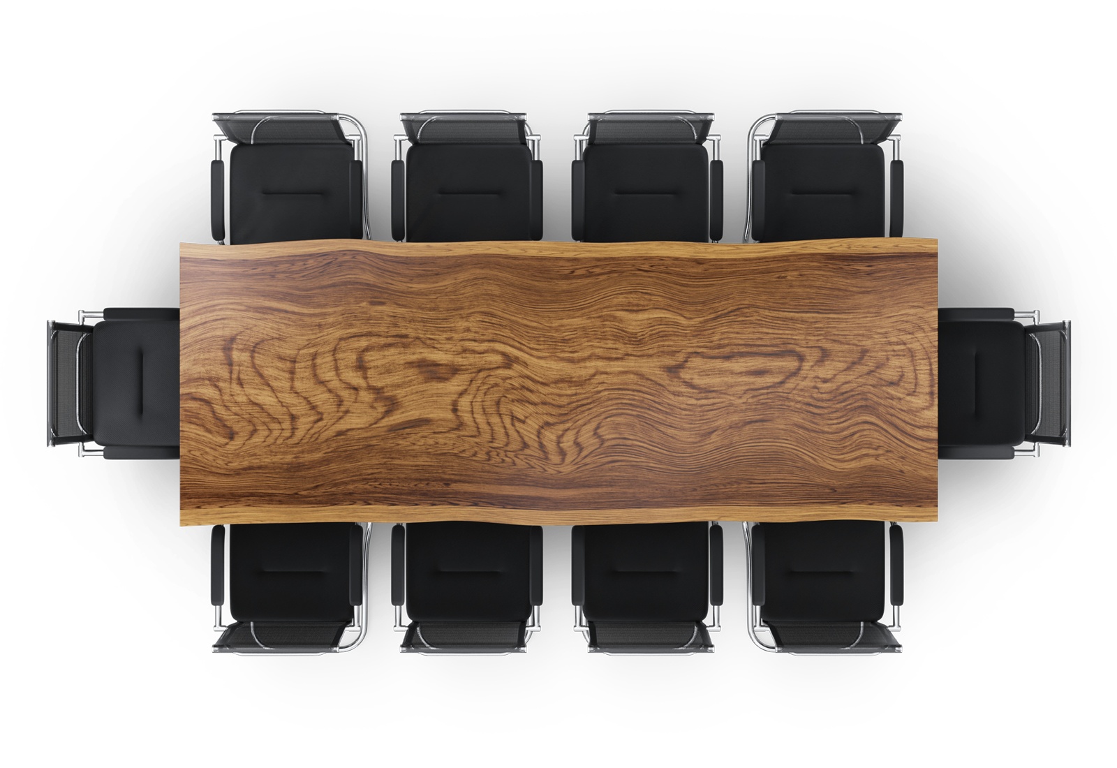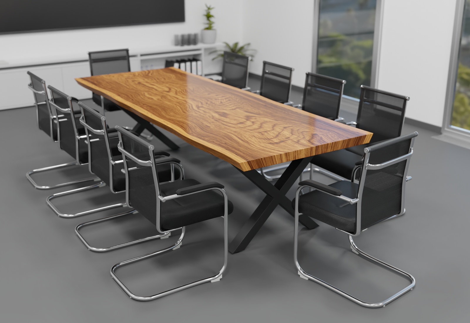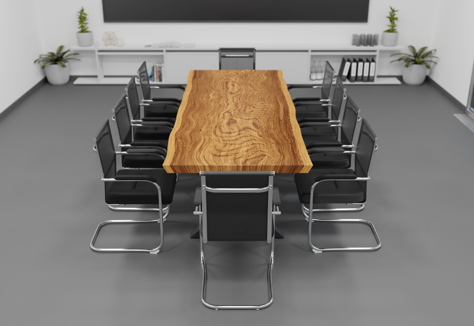 Das extravagante Design mit der braun-beigen Platte aus einem Stück hochwertigem Naturholz, mit der geschwungenen Baumkante und den schwarzen Standfüßen aus Metall macht jeden Konferenztisch zu einem Unikat. Besonders empfehlenswert ist hier die Kombination mit unseren Konferenzstühlen MARINA, welche optisch perfekt auf den Tisch abgestimmt sind. Die beiden schwarzen, X-förmigen Tischfüße an den Enden des formschönen Konferenztischs sorgen für Stabilität und Standsicherheit. Mit Hilfe von Verstrebungen unterhalb der Tischplatte wird die schwere Naturholzplatte sicher gehalten. Diese ist besonders robust ausgelegt, sodass sie auch nach intensivem Gebrauch, mit Aufschrieben von Hand oder verschüttetem Kaffee lange gut aussieht. Hier kann auch einmal auf den Tisch gehauen werden, um einen Standpunkt klarzumachen.