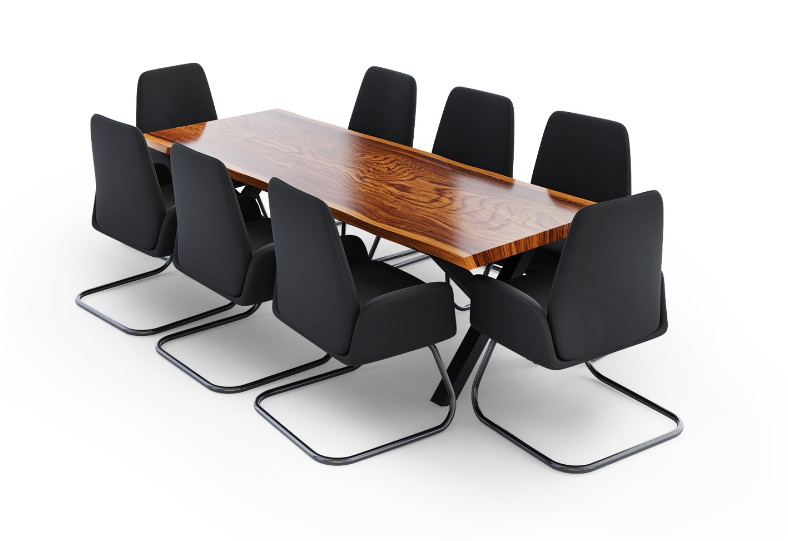 Das extravagante Design mit der braunen Platte aus einem Stück hochwertigem Naturholz, mit der geschwungenen Baumkante und den schwarzen Standfüßen aus Metall macht jeden Konferenztisch zu einem Unikat. Besonders empfehlenswert ist hier die Kombination mit unseren Konferenzstühlen MARIE, welche optisch perfekt auf den Tisch abgestimmt sind. Die beiden schwarzen, X-förmigen Tischfüße an den Enden des formschönen Konferenztischs sorgen für Stabilität und Standsicherheit. Mit Hilfe von Verstrebungen unterhalb der Tischplatte wird die massive, 60 mm dicke Naturholzplatte sicher gehalten. Diese ist besonders robust ausgelegt, sodass sie auch nach intensivem Gebrauch, mit Aufschrieben von Hand oder verschüttetem Kaffee lange gut aussieht. Hier kann auch einmal auf den Tisch gehauen werden, um einen Standpunkt klarzumachen.