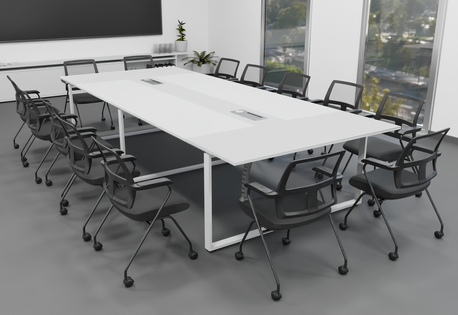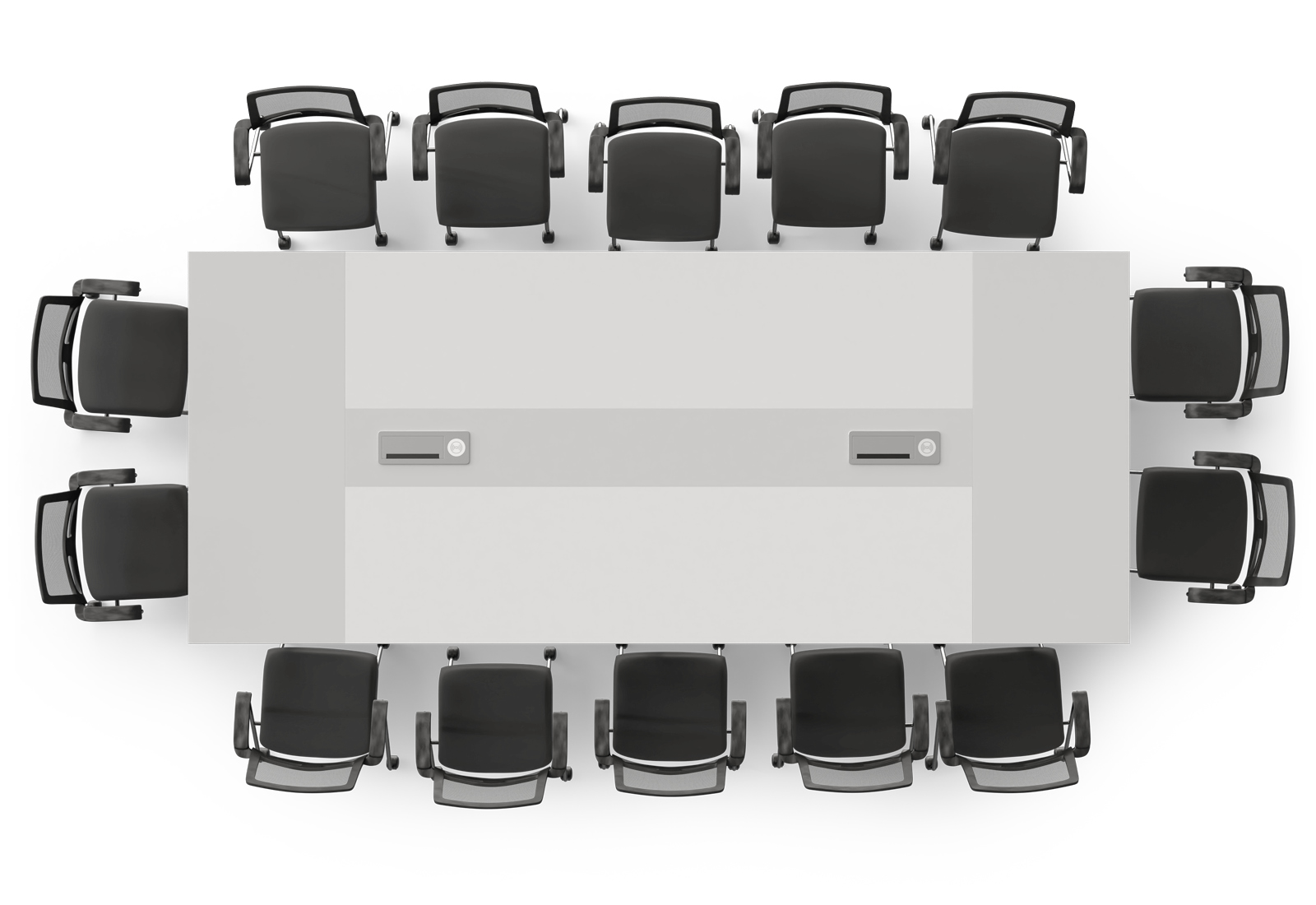 Konferenztisch-Set ANJA360i in Lichtgrau-Weiß mit Induktionsladestation + 14 Stühle EMMA