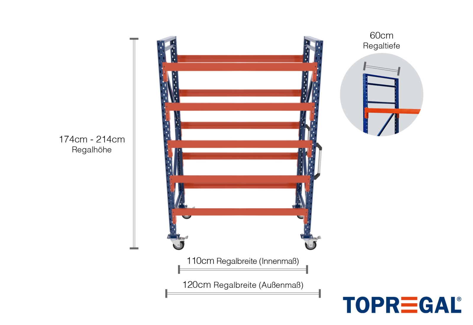 1,2 m Individualregal fahrbar IR2000 / 1.740 - 2.140 mm hoch / 60 cm tief / 5 Ebenen