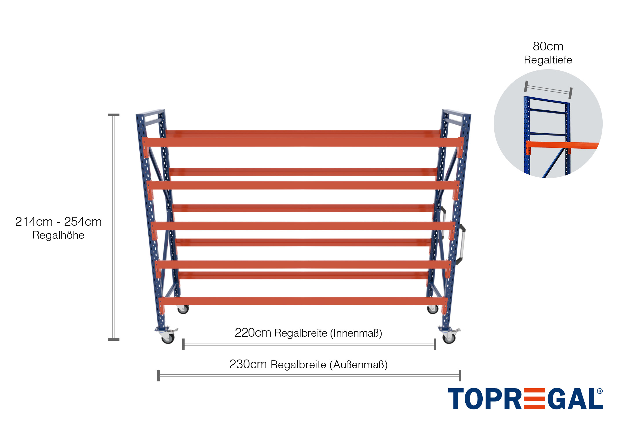 2,3 m Individualregal fahrbar IR2000 / 2.140 - 2.540 mm hoch / 80 cm tief / 5 Ebenen
