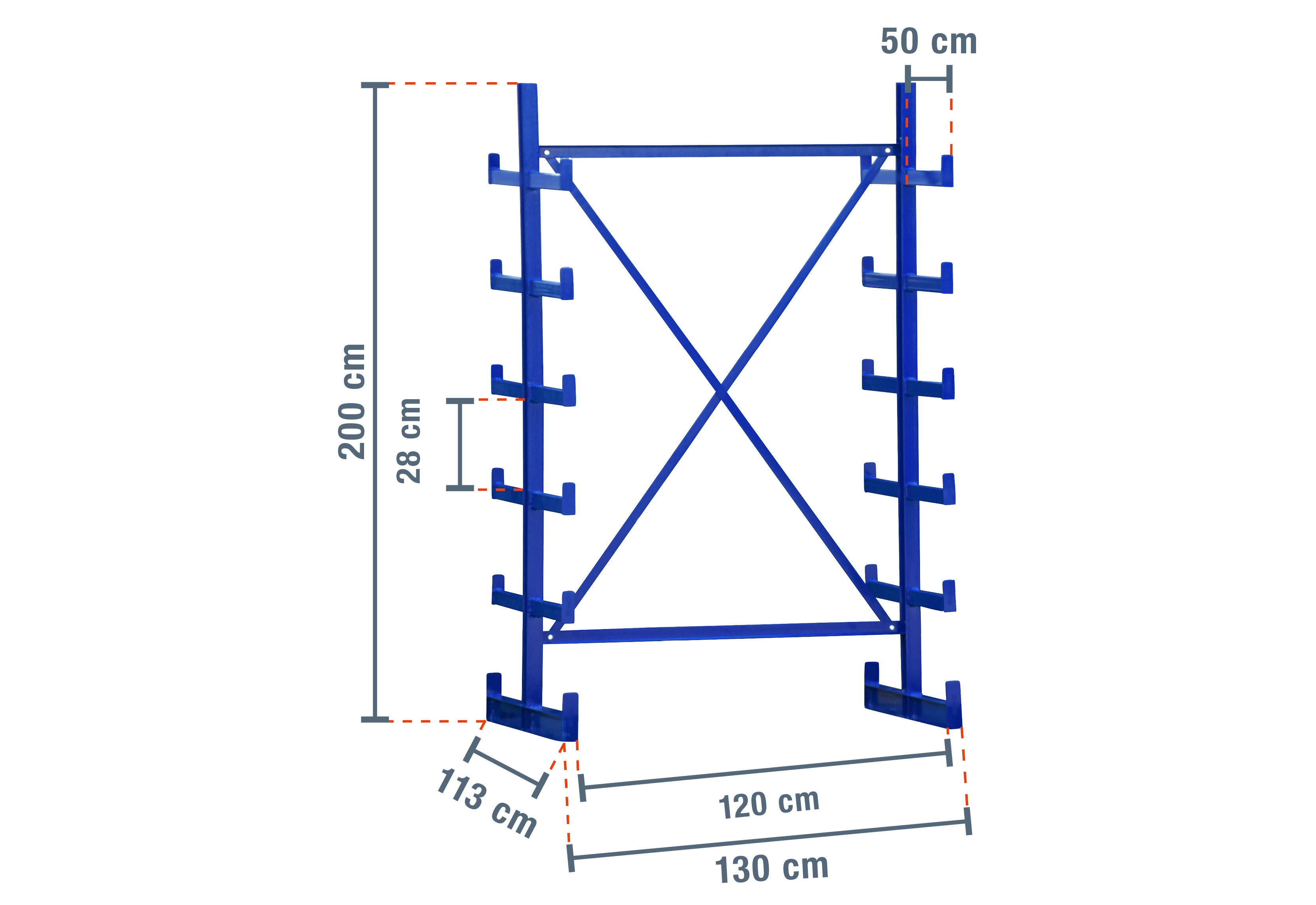 Die einzelnen Ständer werden mithilfe von 2 Quer- und Diagonalstreben (Achsmaß 1.200 mm) miteinander verschraubt. Jeder Kragarm hat eine Auflagebreite von 30 mm und ist mit einer 50 mm hohen Abrollsicherung versehen. Das 50 cm lange Fußteil hat eine Auflagetiefe von 50 cm, eine Auflagebreite von 50 mm und eine 70 mm hohe Abrollsicherung. Somit können die Fußteile auch als Lagerebene genutzt werden.