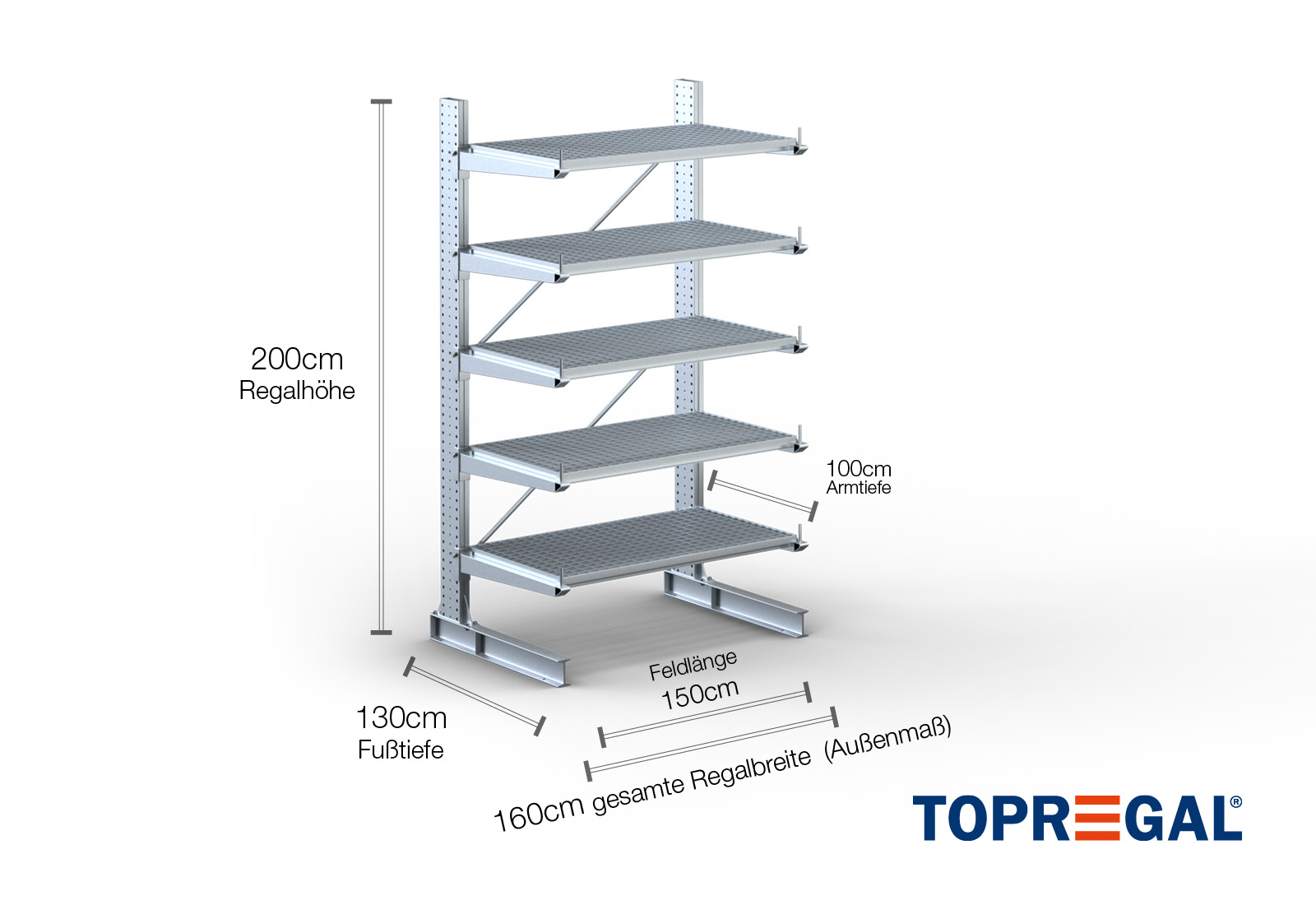 1,6 m Kragarmregal KR3000 / Feuerverzinkt / Einseitig / 2 m hoch / 100 cm Armtiefe / 5 Ebenen / Auflage Gitterrost