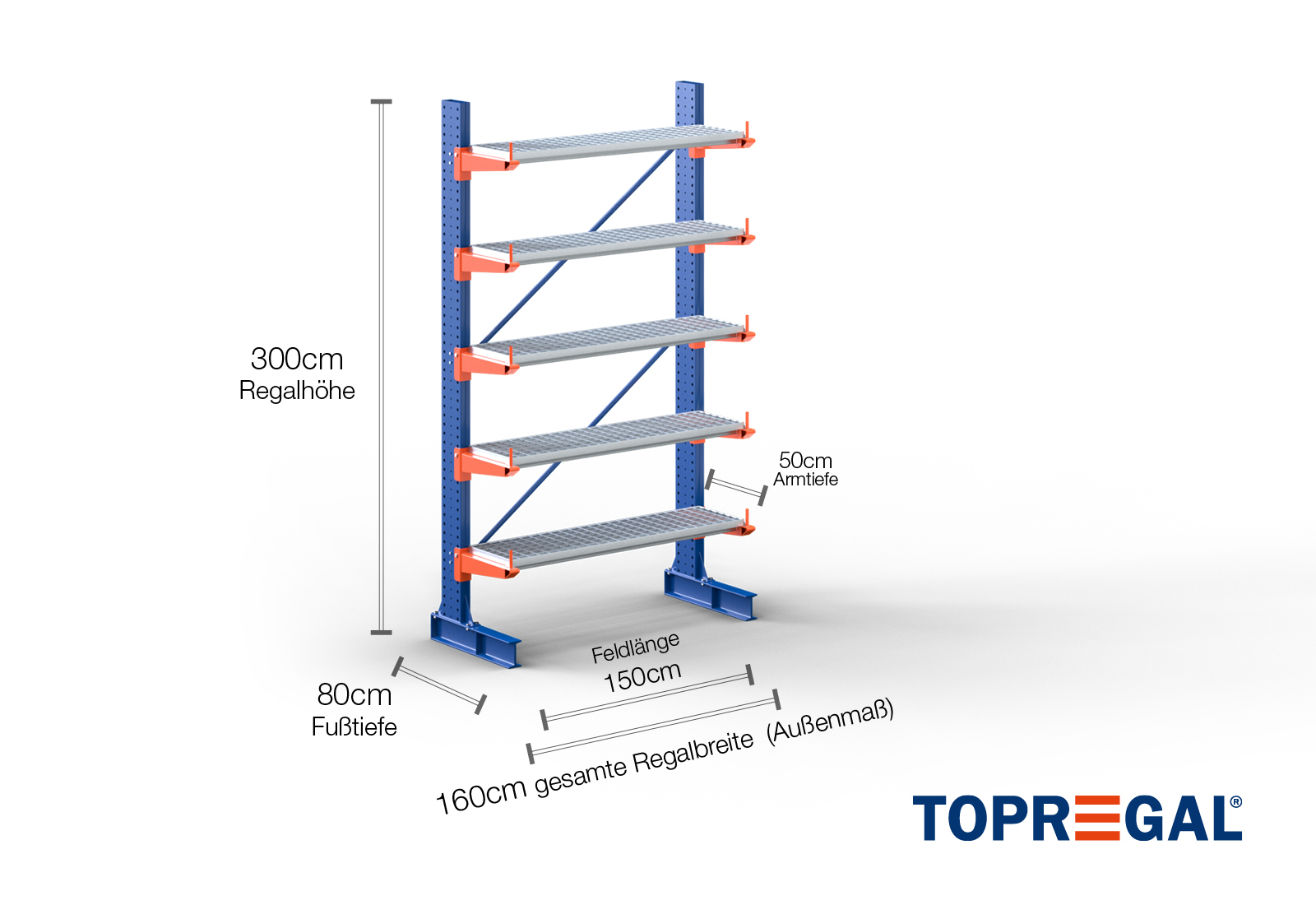 1,6 m Kragarmregal KR3000 / Lackiert / Einseitig / 3 m hoch / 5 Ebenen / 50 cm Armtiefe / Auflage Gitterrost