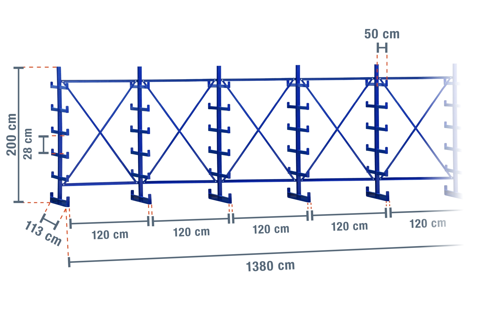 Dieses besonders robuste Kragarmregal mit einer Breite von 13,8 m ist 2 m hoch und hat 5 Ebenen mit einer Armtiefe von 50 cm. Dank der doppelseitigen Ausführung mit bereits angeschweißten Kragarmen können Sie jeden Ständer mit maximal 2.500 kg belasten, wobei jeder Arm eine maximale Belastung von 250 kg hat.