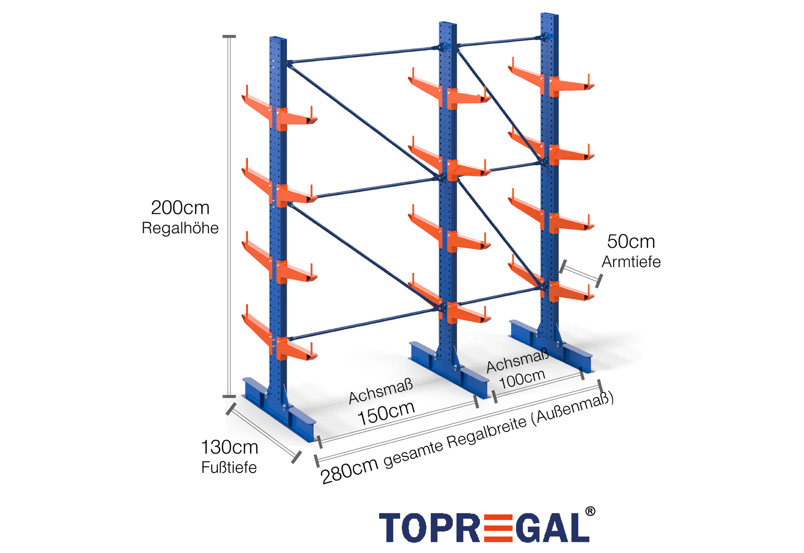 Als Achsmaß wird das Innenmaß zwischen zwei Regalständer bezeichnet. Je nach Kragarmtyp bieten wir Ihnen diese Felder in 120 cm (KR2500) und in 100 cm / 150 cm (KR3000 / KR6000) an.