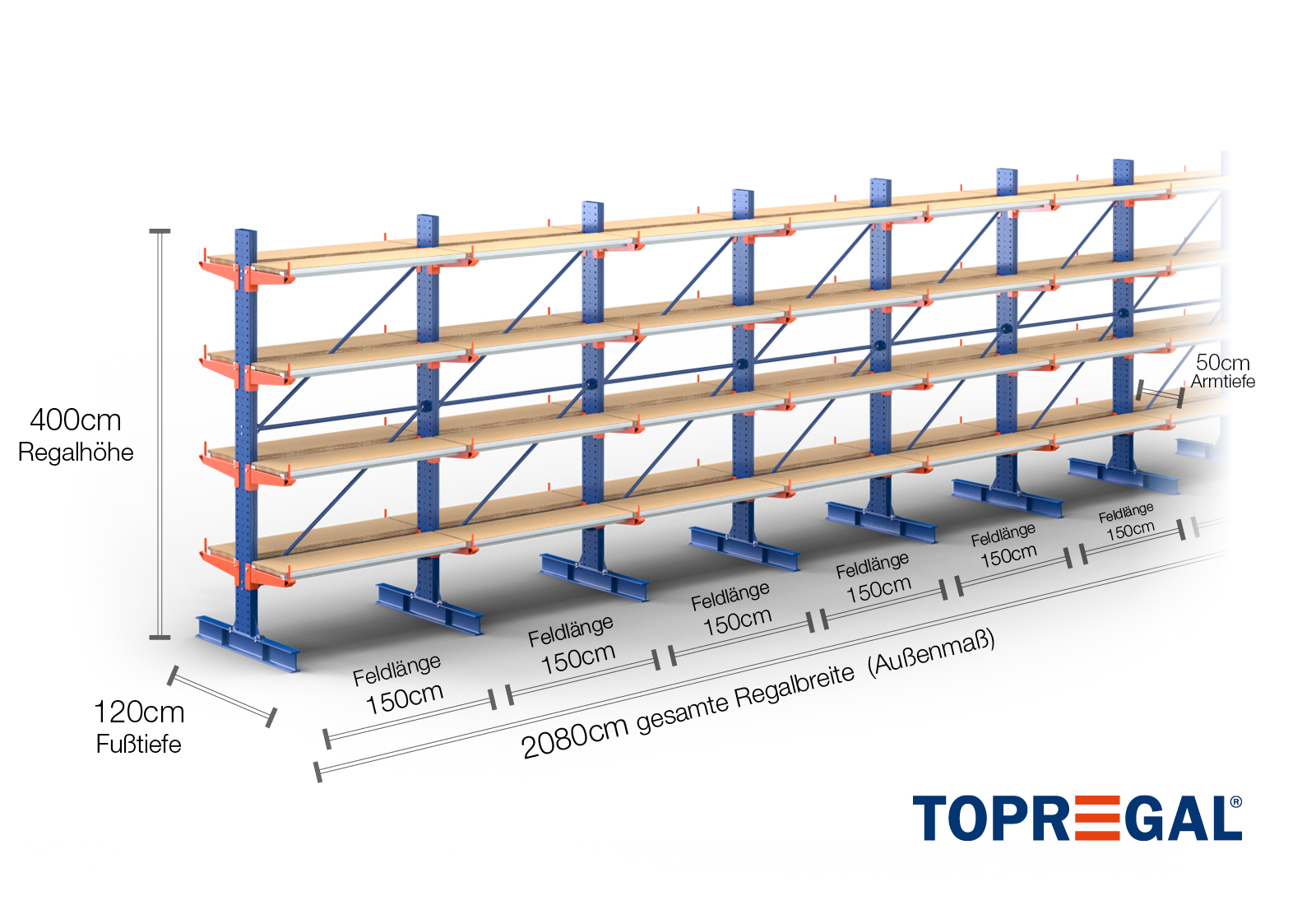20,8 m Kragarmregal KR3000 / Lackiert / Doppelseitig / 4 m hoch / 50 cm Armtiefe / 4 Ebenen / Auflage Holz
