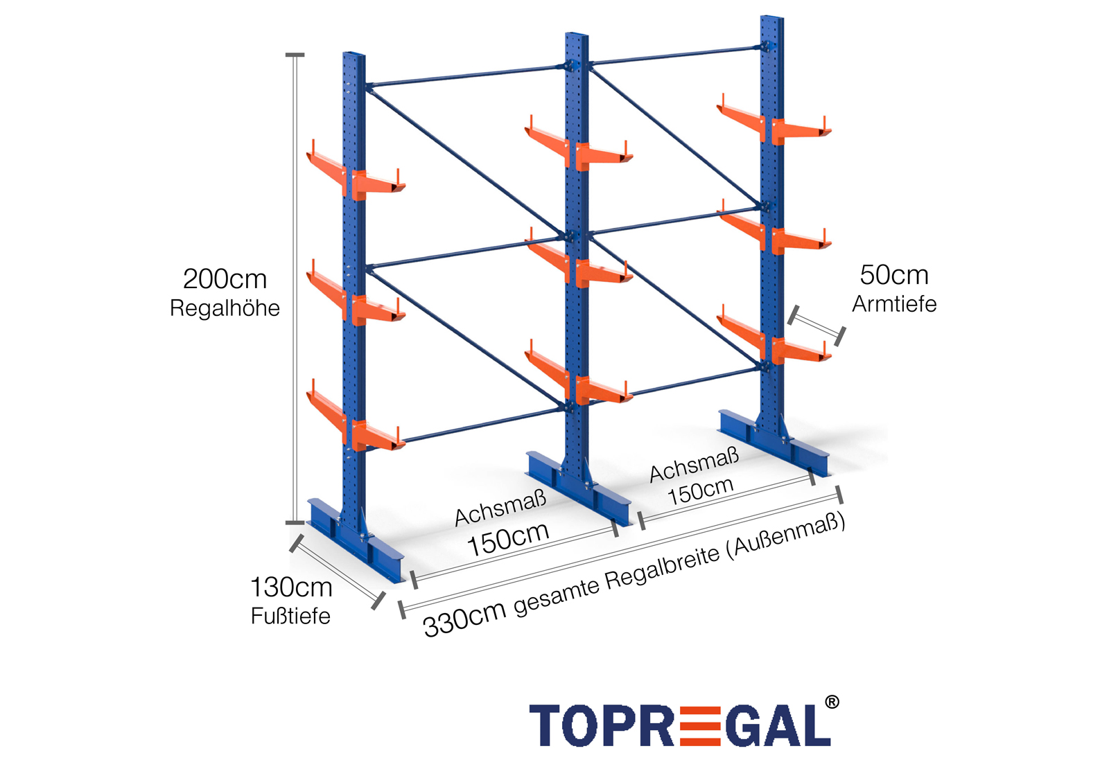 Dieses Kragarmregal in doppelseitiger Ausführung mit einer Breite von 3,3 m ist 2 m hoch, hat eine Gesamttiefe von 120 cm und verfügt über 3 Kragarmebenen, mit einer Armtiefe von 50 cm. Die maximale Belastung pro Arm beträgt hierbei maximal 500 kg. Die Kragarme können im Rastermaß von 50 mm individuell eingehängt und per Sicherungsbolzen und -stift gesichert werden. Auch die Fußteile können (je nach Gut) als Lagerebene genutzt werden. Um die Ladung vor versehentlichem Abrutschen zu schützen, kann am Ende eines jeden Kragarms eine Abrollsicherung eingesteckt werden. Diese ist standardmäßig im Lieferumfang enthalten.
