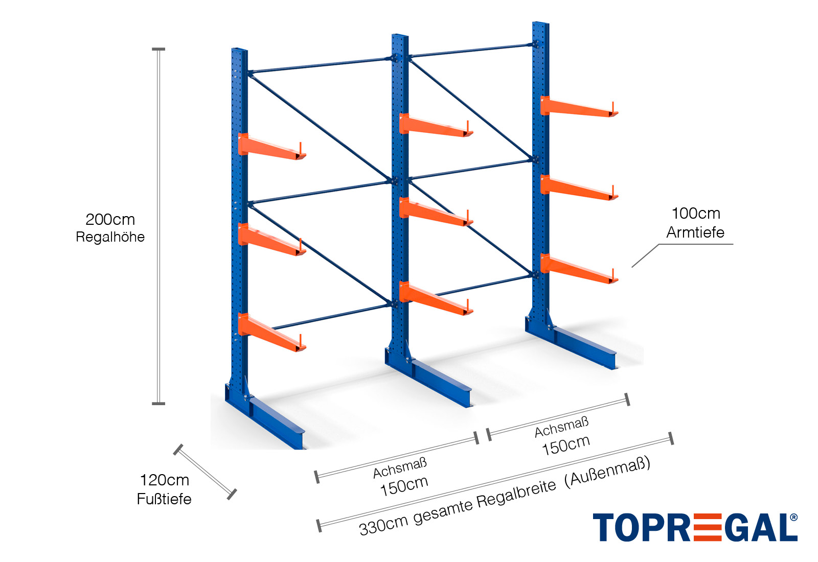 Dieses Kragarmregal in einseitiger Ausführung mit einer Breite von 3,3 m ist 2 m hoch, hat eine Gesamttiefe von 120 cm und verfügt über 3 Kragarmebenen, mit einer Armtiefe von 100 cm. Die maximale Belastung pro Arm beträgt hierbei maximal 500 kg. Die Kragarme können im Rastermaß von 50 mm individuell eingehängt und per Sicherungsbolzen und -stift gesichert werden. Auch die Fußteile können (je nach Gut) als Lagerebene genutzt werden. Um die Ladung vor versehentlichem Abrutschen zu schützen, kann am Ende eines jeden Kragarms eine Abrollsicherung eingesteckt werden. Diese ist standardmäßig im Lieferumfang enthalten.