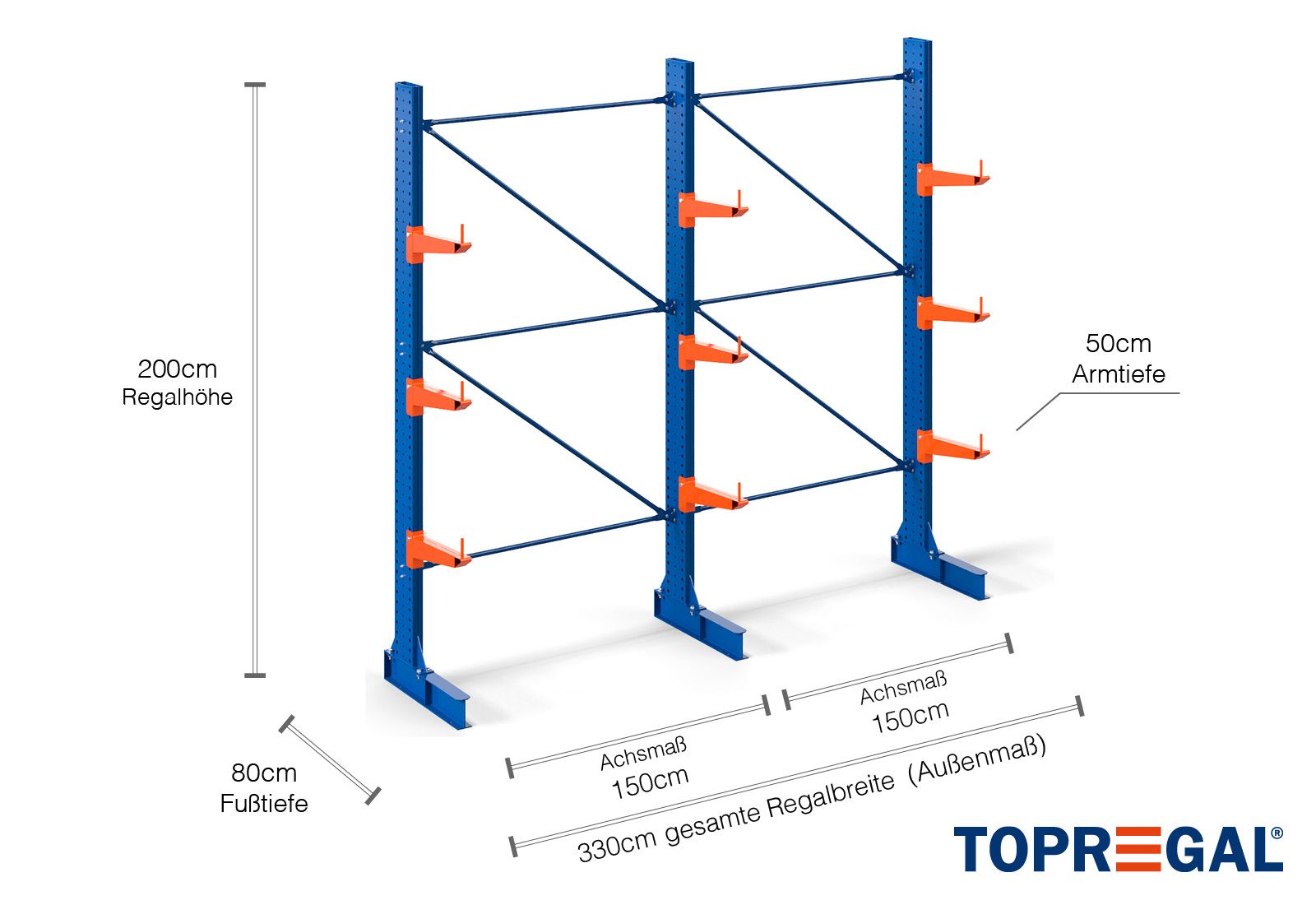 3,3 m Kragarmregal KR3000 / Lackiert / Einseitig / 50 cm Armtiefe / 2 m hoch / 3 Ebenen