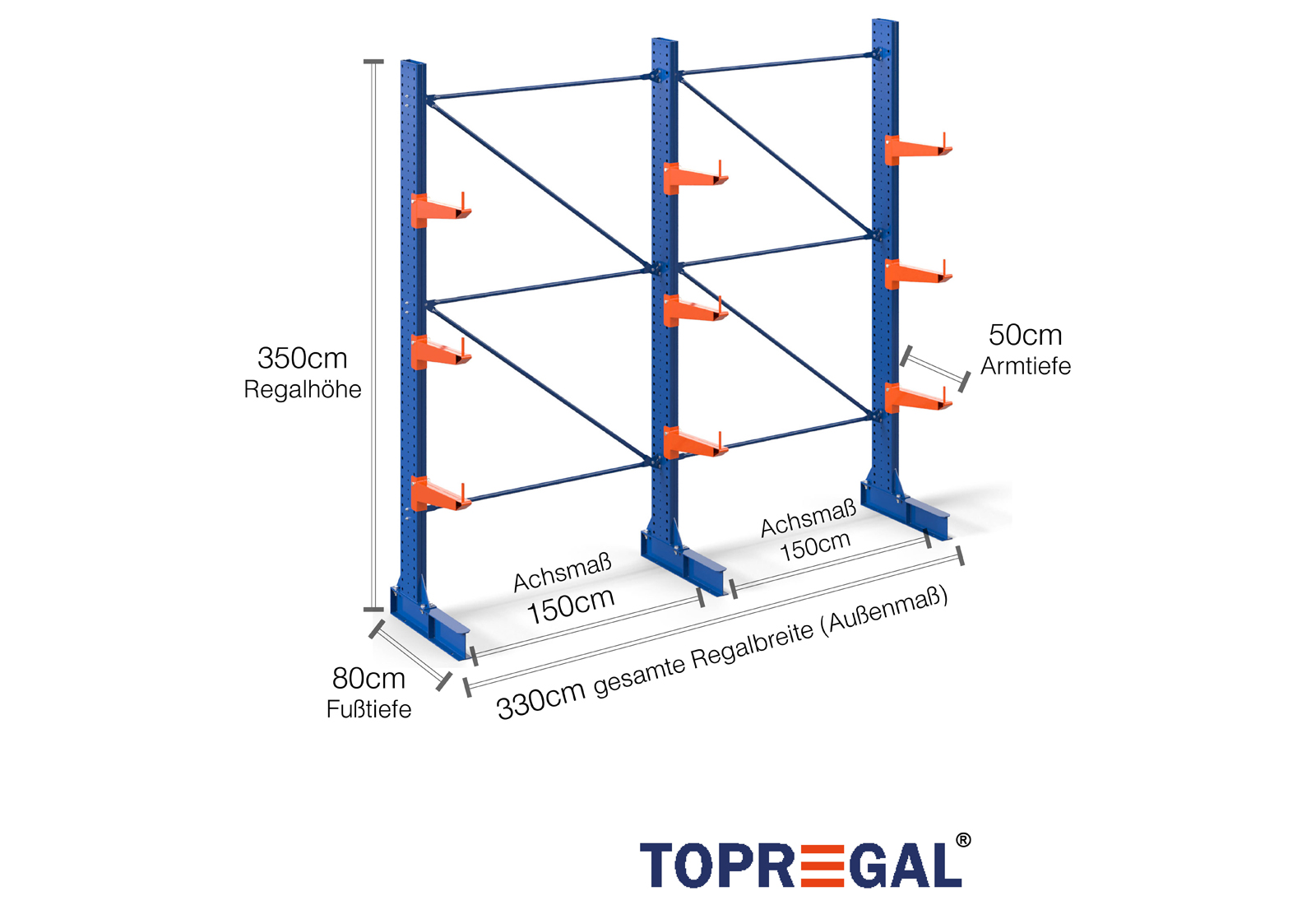 Dieses Kragarmregal in einseitiger Ausführung mit einer Breite von 3,3 m ist 3,5 m hoch, hat eine Gesamttiefe von 80 cm und verfügt über 3 Kragarmebenen, mit einer Armtiefe von 50 cm. Die maximale Belastung pro Arm beträgt hierbei maximal 500 kg. Die Kragarme können im Rastermaß von 50 mm individuell eingehängt und per Sicherungsbolzen und -stift gesichert werden. Auch die Fußteile können (je nach Gut) als Lagerebene genutzt werden. Um die Ladung vor versehentlichem Abrutschen zu schützen, kann am Ende eines jeden Kragarms eine Abrollsicherung eingesteckt werden. Diese ist standardmäßig im Lieferumfang enthalten.