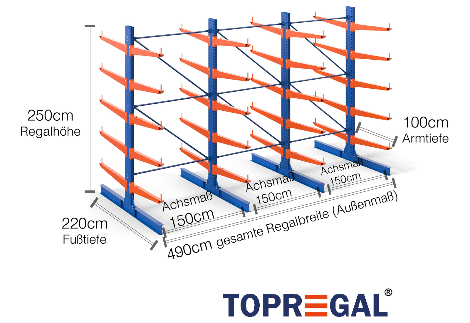 Als Achsmaß wird das Innenmaß zwischen zwei Regalständer bezeichnet. Je nach Kragarmtyp bieten wir Ihnen diese Felder in 120 cm (KR2500) und in 100 cm / 150 cm (KR3000 / KR6000) an.