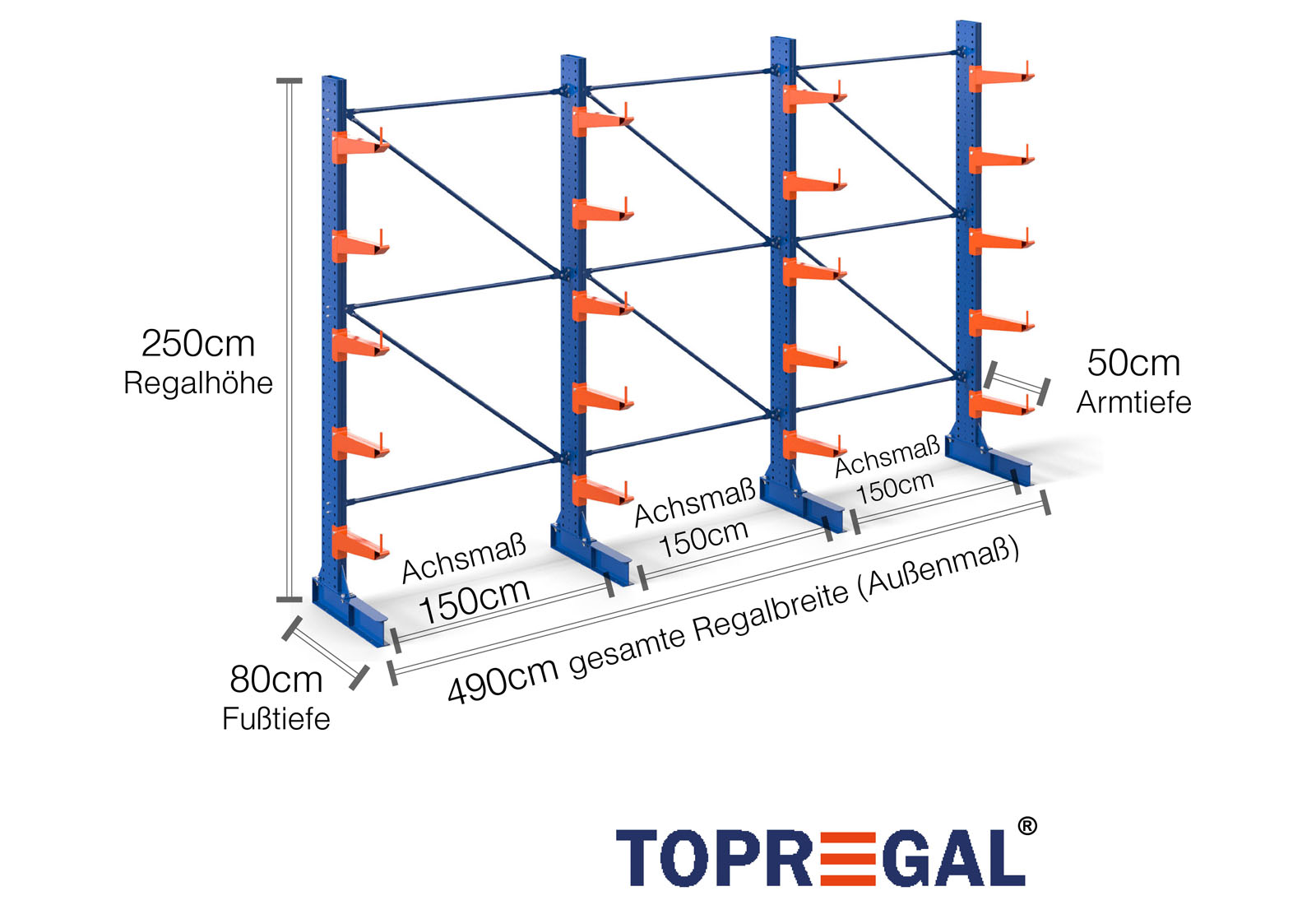 Als Achsmaß wird das Innenmaß zwischen zwei Regalständer bezeichnet. Je nach Kragarmtyp bieten wir Ihnen diese Felder in 120 cm (KR2500) und in 100 cm / 150 cm (KR3000 / KR6000) an.