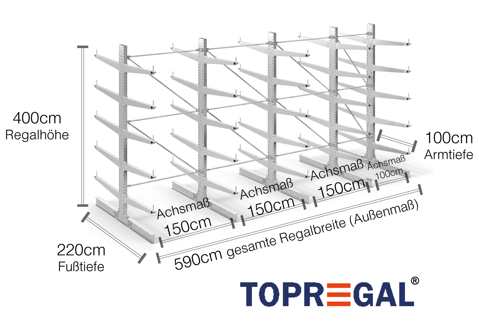 Dieses Kragarmregal in doppelseitiger Ausführung mit einer Breite von 5,9 m ist 4 m hoch, hat eine Gesamttiefe von 220 cm und verfügt über 5 Kragarmebenen, mit einer Armtiefe von 100 cm. Die maximale Belastung pro Arm beträgt hierbei maximal 500 kg. Die Kragarme können im Rastermaß von 50 mm individuell eingehängt und per Sicherungsbolzen und -stift gesichert werden. Auch die Fußteile können (je nach Gut) als Lagerebene genutzt werden. Um die Ladung vor versehentlichem Abrutschen zu schützen, kann am Ende eines jeden Kragarms eine Abrollsicherung eingesteckt werden. Diese ist standardmäßig im Lieferumfang enthalten.