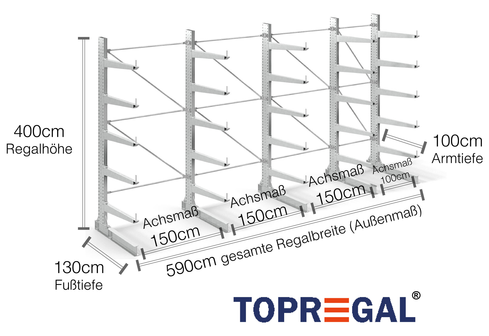 Dieses Kragarmregal in einseitiger Ausführung mit einer Breite von 5,9 m ist 4 m hoch, hat eine Gesamttiefe von 130 cm und verfügt über 5 Kragarmebenen, mit einer Armtiefe von 100 cm. Die maximale Belastung pro Arm beträgt hierbei maximal 500 kg. Die Kragarme können im Rastermaß von 50 mm individuell eingehängt und per Sicherungsbolzen und -stift gesichert werden. Auch die Fußteile können (je nach Gut) als Lagerebene genutzt werden. Um die Ladung vor versehentlichem Abrutschen zu schützen, kann am Ende eines jeden Kragarms eine Abrollsicherung eingesteckt werden. Diese ist standardmäßig im Lieferumfang enthalten.