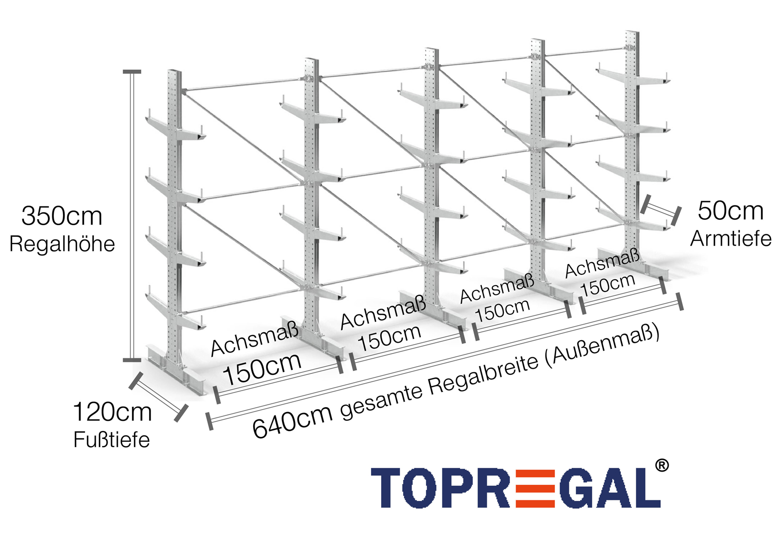 Als Achsmaß wird das Innenmaß zwischen zwei Regalständer bezeichnet. Je nach Kragarmtyp bieten wir Ihnen diese Felder in 120 cm (KR2500) und in 100 cm / 150 cm (KR3000 / KR6000) an.
