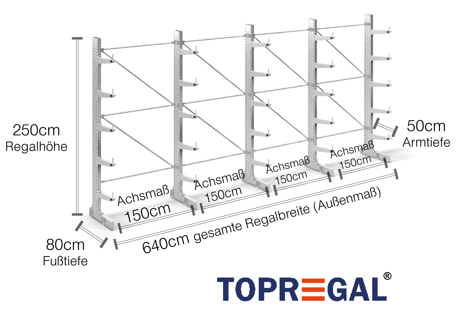 Dieses Kragarmregal in einseitiger Ausführung mit einer Breite von 6,4 m ist 2,5 m hoch, hat eine Gesamttiefe von 80 cm und verfügt über 5 Kragarmebenen, mit einer Armtiefe von 50 cm. Die maximale Belastung pro Arm beträgt hierbei maximal 500 kg. Die Kragarme können im Rastermaß von 50 mm individuell eingehängt und per Sicherungsbolzen und -stift gesichert werden. Auch die Fußteile können (je nach Gut) als Lagerebene genutzt werden. Um die Ladung vor versehentlichem Abrutschen zu schützen, kann am Ende eines jeden Kragarms eine Abrollsicherung eingesteckt werden. Diese ist standardmäßig im Lieferumfang enthalten.