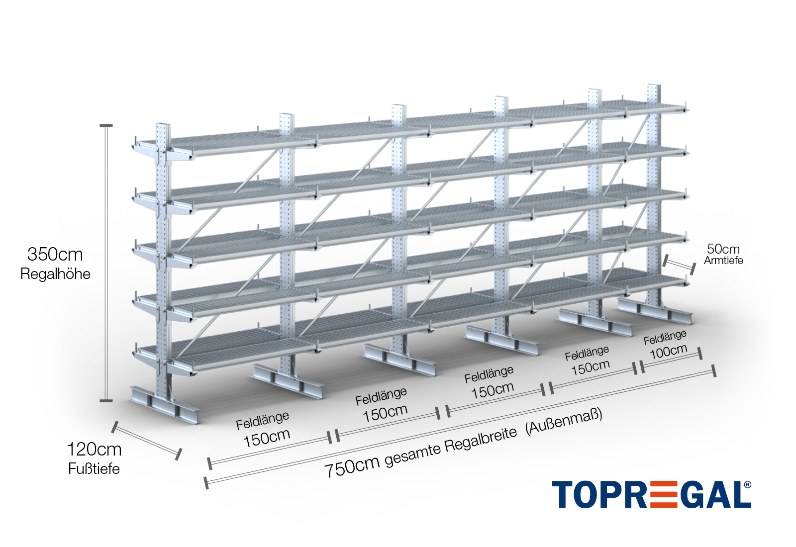 7,5 m Kragarmregal KR3000 / Feuerverzinkt / Doppelseitig / 3,5 m hoch / 50 cm Armtiefe / 5 Ebenen / Auflage Gitterrost