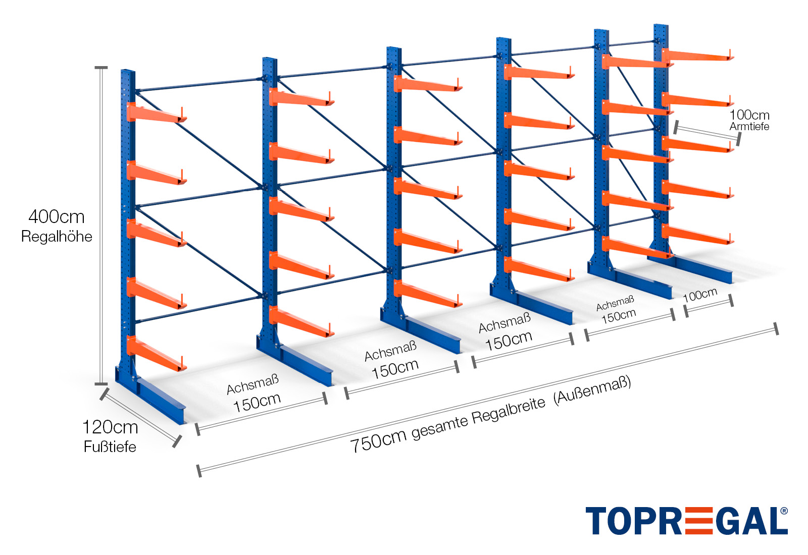 Dieses Kragarmregal in einseitiger Ausführung mit einer Breite von 7,5 m ist 4 m hoch, hat eine Gesamttiefe von 120 cm und verfügt über 5 Kragarmebenen, mit einer Armtiefe von 100 cm. Die maximale Belastung pro Arm beträgt hierbei maximal 500 kg. Die Kragarme können im Rastermaß von 50 mm individuell eingehängt und per Sicherungsbolzen und -stift gesichert werden. Auch die Fußteile können (je nach Gut) als Lagerebene genutzt werden. Um die Ladung vor versehentlichem Abrutschen zu schützen, kann am Ende eines jeden Kragarms eine Abrollsicherung eingesteckt werden. Diese ist standardmäßig im Lieferumfang enthalten.