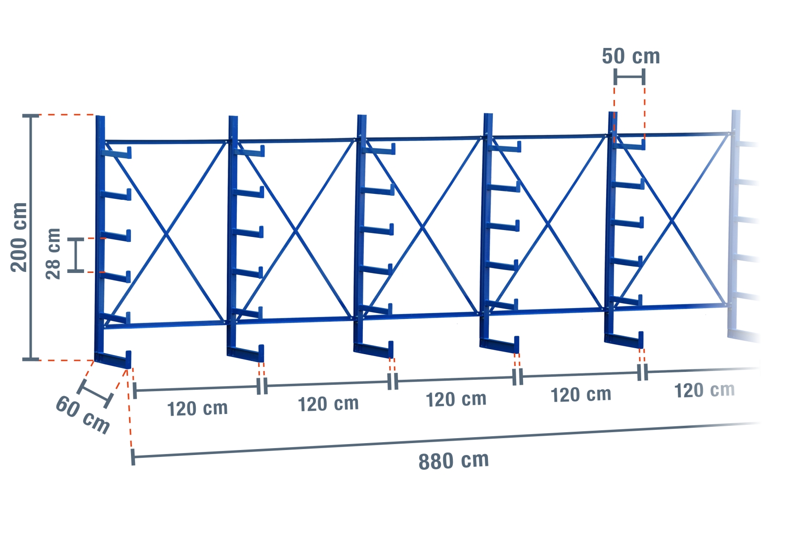 8,8 m Kragarmregal KR2500 / Lackiert / Einseitig / 2 m hoch / 5 Ebenen / 50 cm Armtiefe
