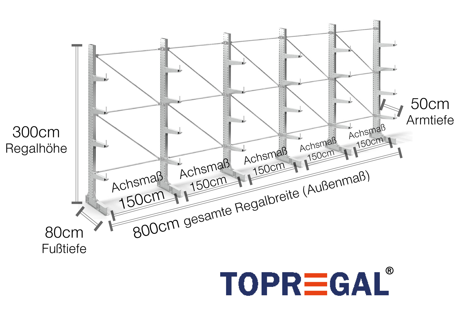 Dieses Kragarmregal in einseitiger Ausführung mit einer Breite von 8 m ist 3 m hoch, hat eine Gesamttiefe von 80 cm und verfügt über 4 Kragarmebenen, mit einer Armtiefe von 50 cm. Die maximale Belastung pro Arm beträgt hierbei maximal 500 kg. Die Kragarme können im Rastermaß von 50 mm individuell eingehängt und per Sicherungsbolzen und -stift gesichert werden. Auch die Fußteile können (je nach Gut) als Lagerebene genutzt werden. Um die Ladung vor versehentlichem Abrutschen zu schützen, kann am Ende eines jeden Kragarms eine Abrollsicherung eingesteckt werden. Diese ist standardmäßig im Lieferumfang enthalten.