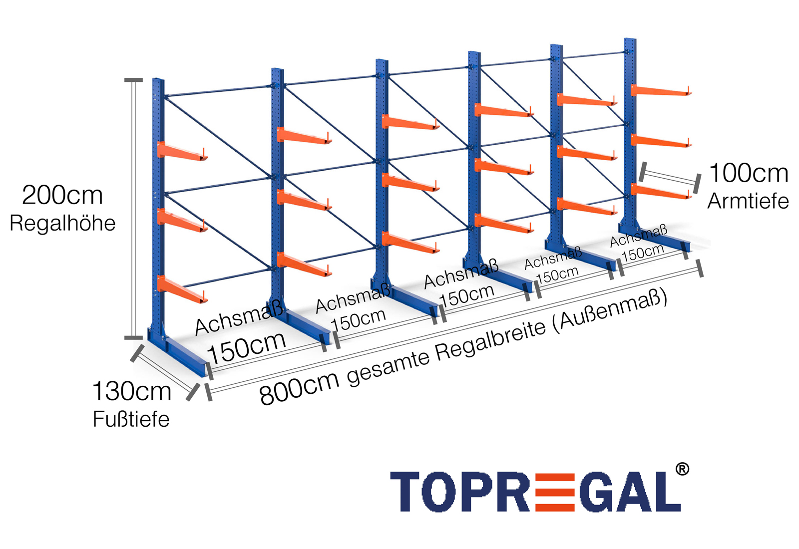 Als Achsmaß wird das Innenmaß zwischen zwei Regalständer bezeichnet. Je nach Kragarmtyp bieten wir Ihnen diese Felder in 120 cm (KR2500) und in 100 cm / 150 cm (KR3000 / KR6000) an.