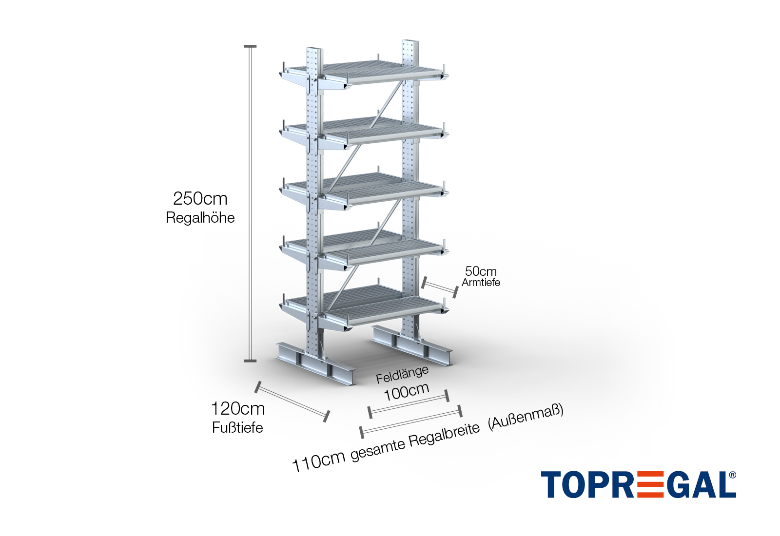 1,1 m Kragarmregal KR3000 / Feuerverzinkt / Doppelseitig / 2,5 m hoch / 50 cm Armtiefe / 5 Ebenen / Auflage Gitterrost